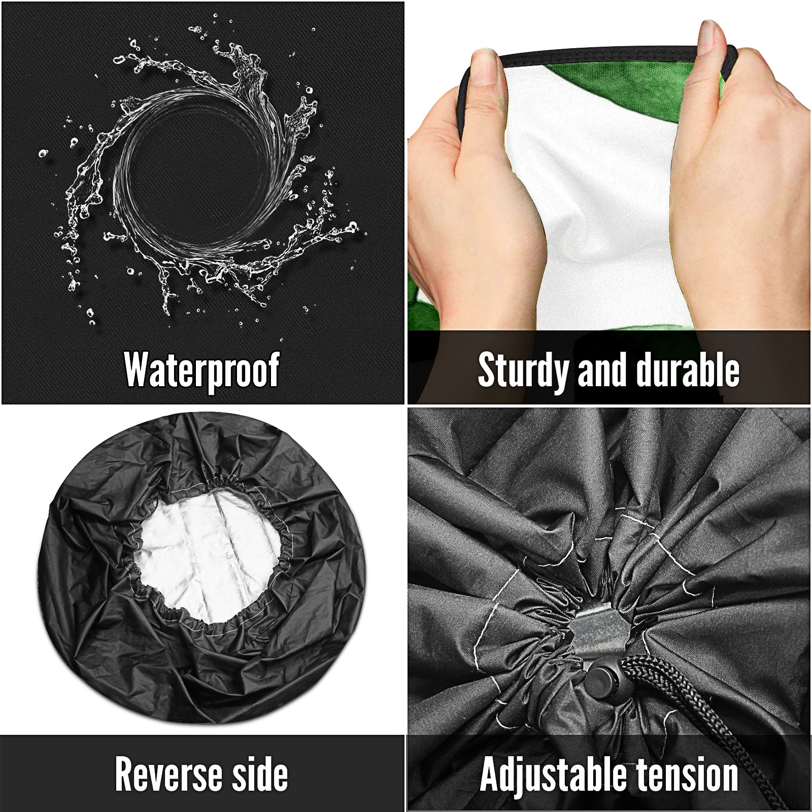 • <p>Keep your spare tire protected and your vehicle looking sharp with our universal Tire Cover. Designed with a sleek single-sided print and classic black sides, this rugged cover is made from high-quality polyester fabric that is fully waterproof. The adjustable nylon rope ensures a secure, custom fit for any tire, helping to maintain a clean and professional appearance for your vehicle.</p>