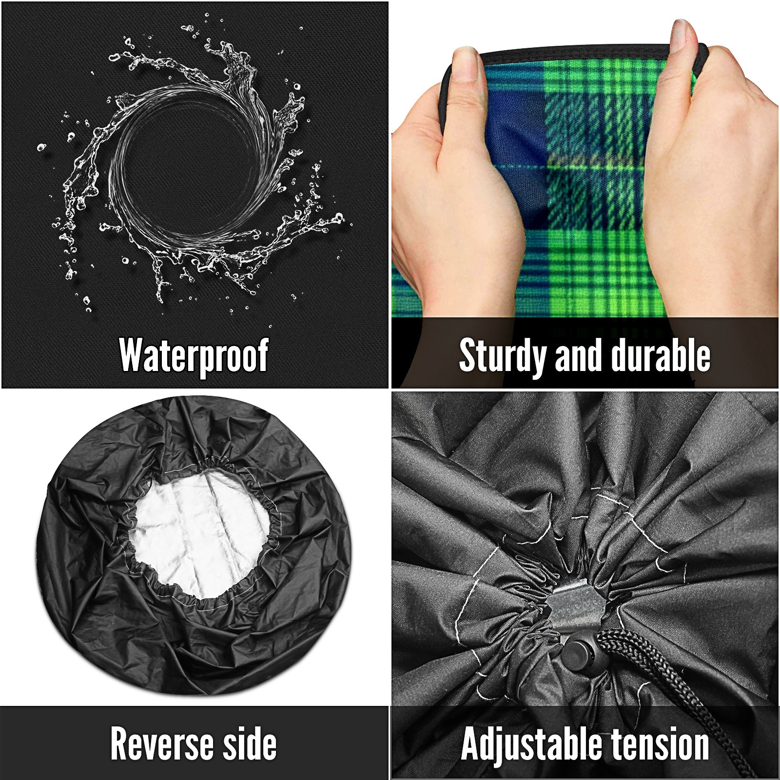 • <p>Keep your spare tire protected and your vehicle looking sharp with our universal Tire Cover. Designed with a sleek single-sided print and classic black sides, this rugged cover is made from high-quality polyester fabric that is fully waterproof. The adjustable nylon rope ensures a secure, custom fit for any tire, helping to maintain a clean and professional appearance for your vehicle.</p>