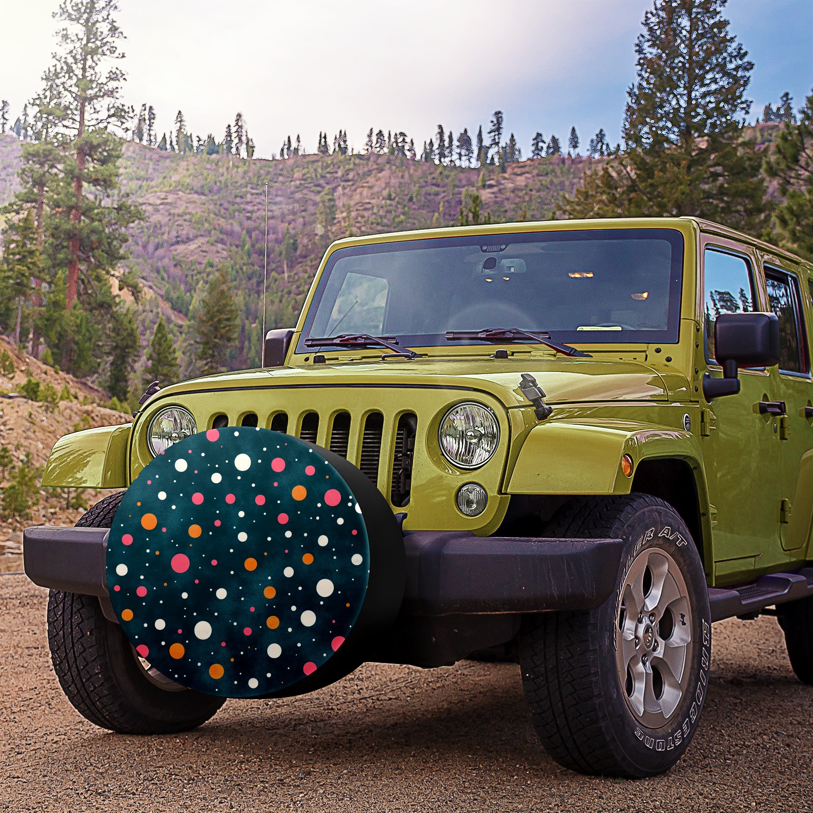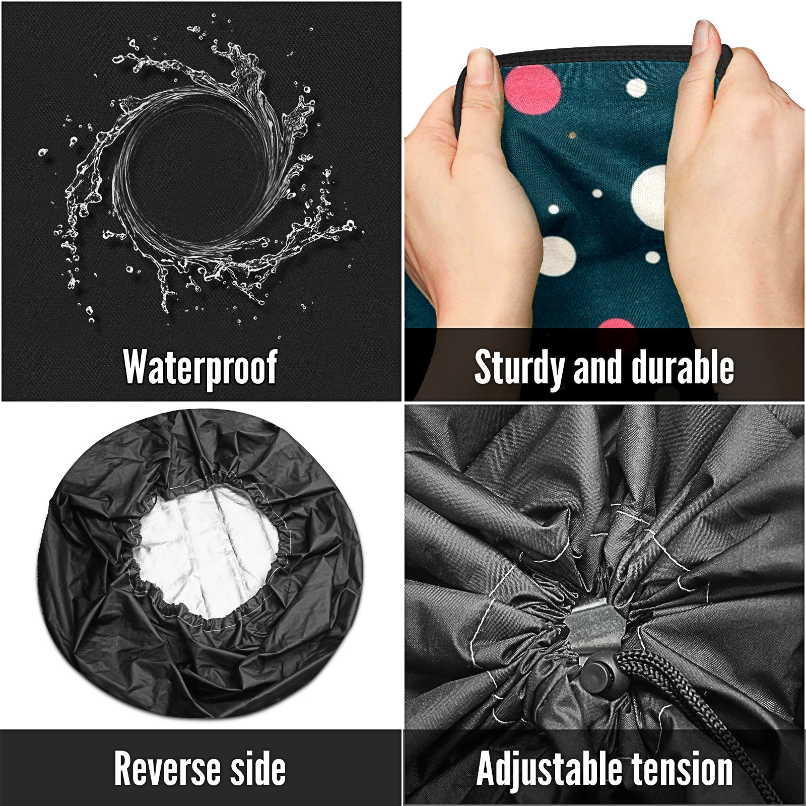 • <p>Keep your spare tire protected and your vehicle looking sharp with our universal Tire Cover. Designed with a sleek single-sided print and classic black sides, this rugged cover is made from high-quality polyester fabric that is fully waterproof. The adjustable nylon rope ensures a secure, custom fit for any tire, helping to maintain a clean and professional appearance for your vehicle.</p>