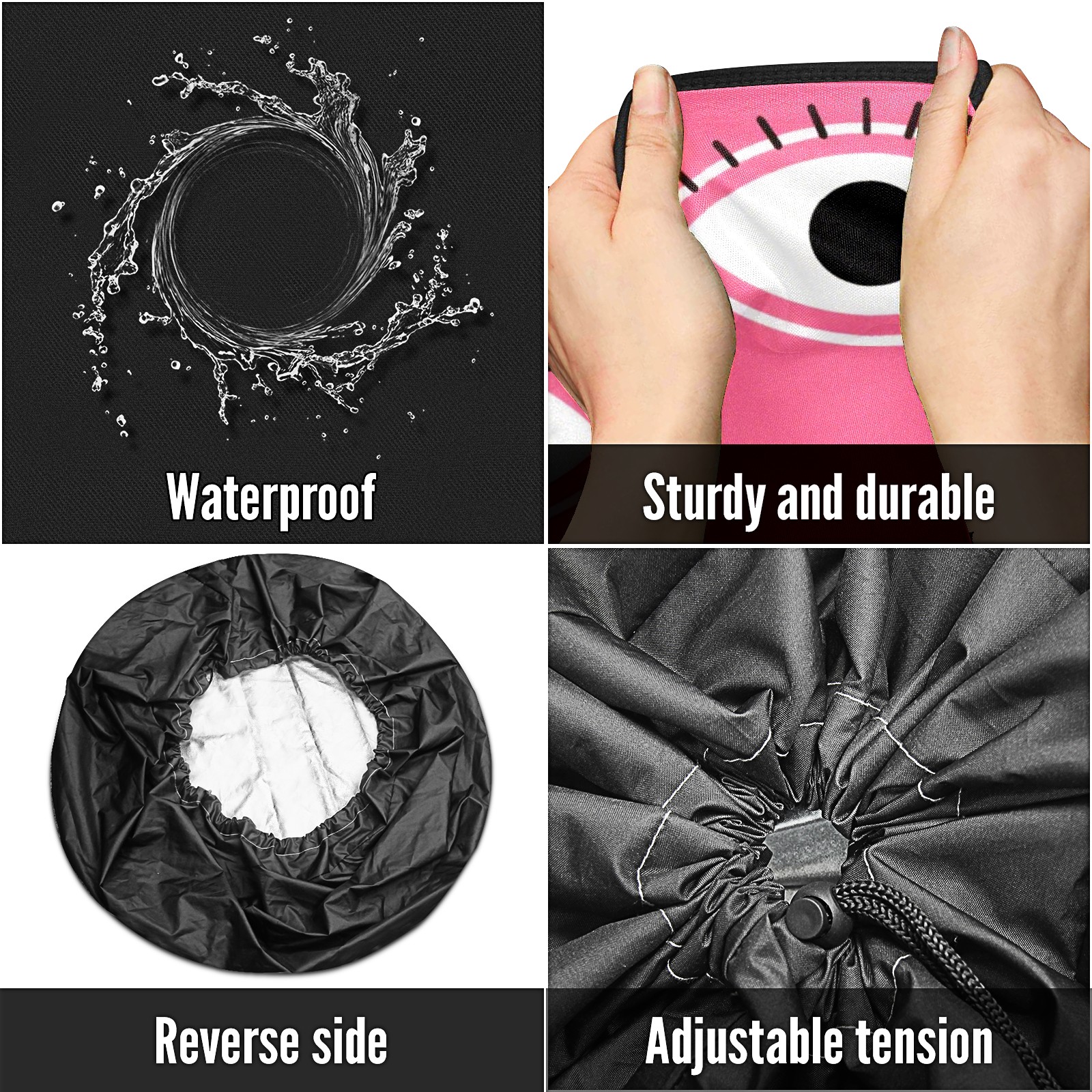 • <p>Keep your spare tire protected and your vehicle looking sharp with our universal Tire Cover. Designed with a sleek single-sided print and classic black sides, this rugged cover is made from high-quality polyester fabric that is fully waterproof. The adjustable nylon rope ensures a secure, custom fit for any tire, helping to maintain a clean and professional appearance for your vehicle.</p>