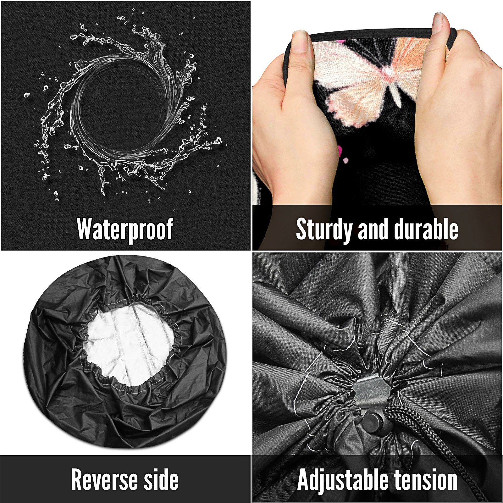 • <p>Keep your spare tire protected and your vehicle looking sharp with our universal Tire Cover. Designed with a sleek single-sided print and classic black sides, this rugged cover is made from high-quality polyester fabric that is fully waterproof. The adjustable nylon rope ensures a secure, custom fit for any tire, helping to maintain a clean and professional appearance for your vehicle.</p>