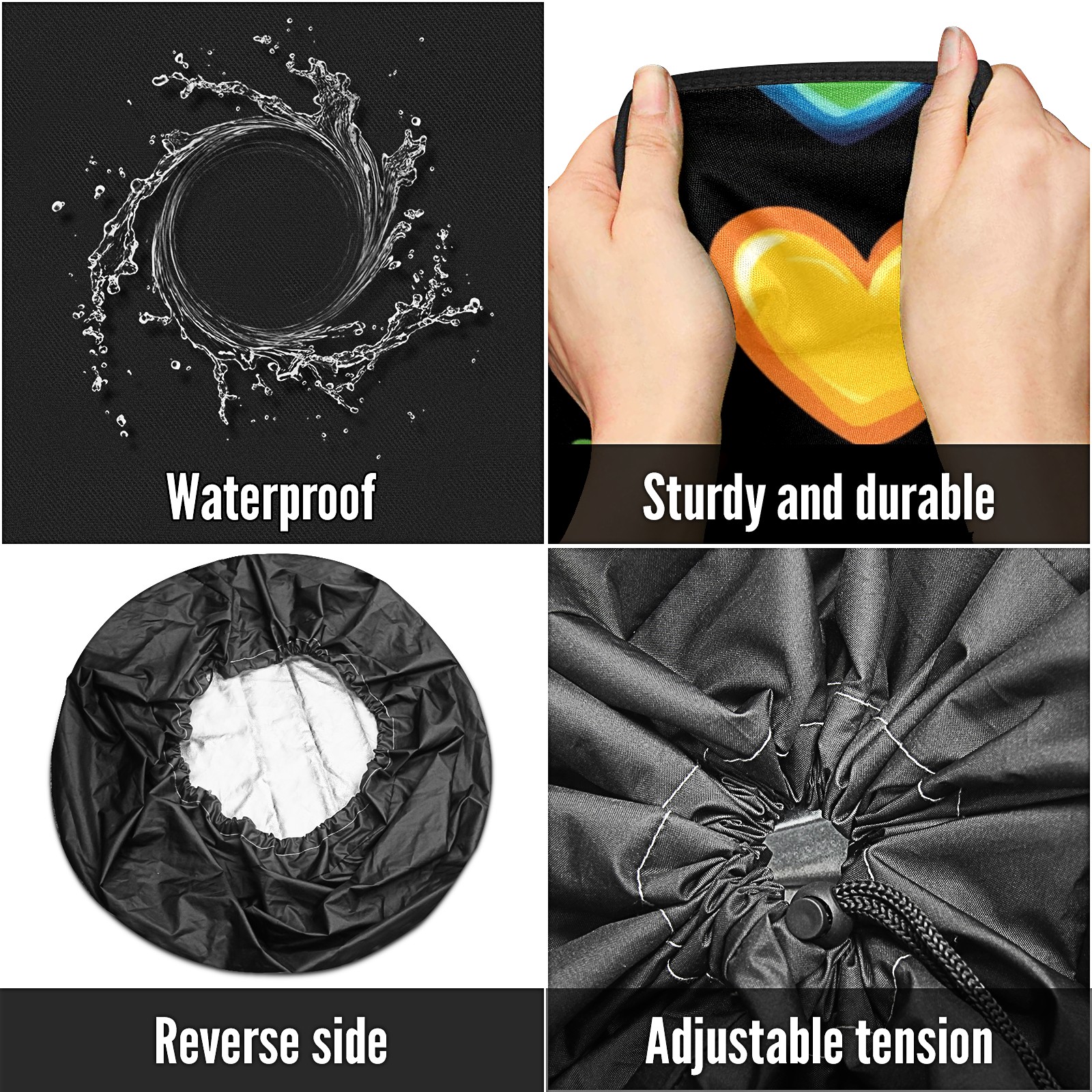 • <p>Keep your spare tire protected and your vehicle looking sharp with our universal Tire Cover. Designed with a sleek single-sided print and classic black sides, this rugged cover is made from high-quality polyester fabric that is fully waterproof. The adjustable nylon rope ensures a secure, custom fit for any tire, helping to maintain a clean and professional appearance for your vehicle.</p>