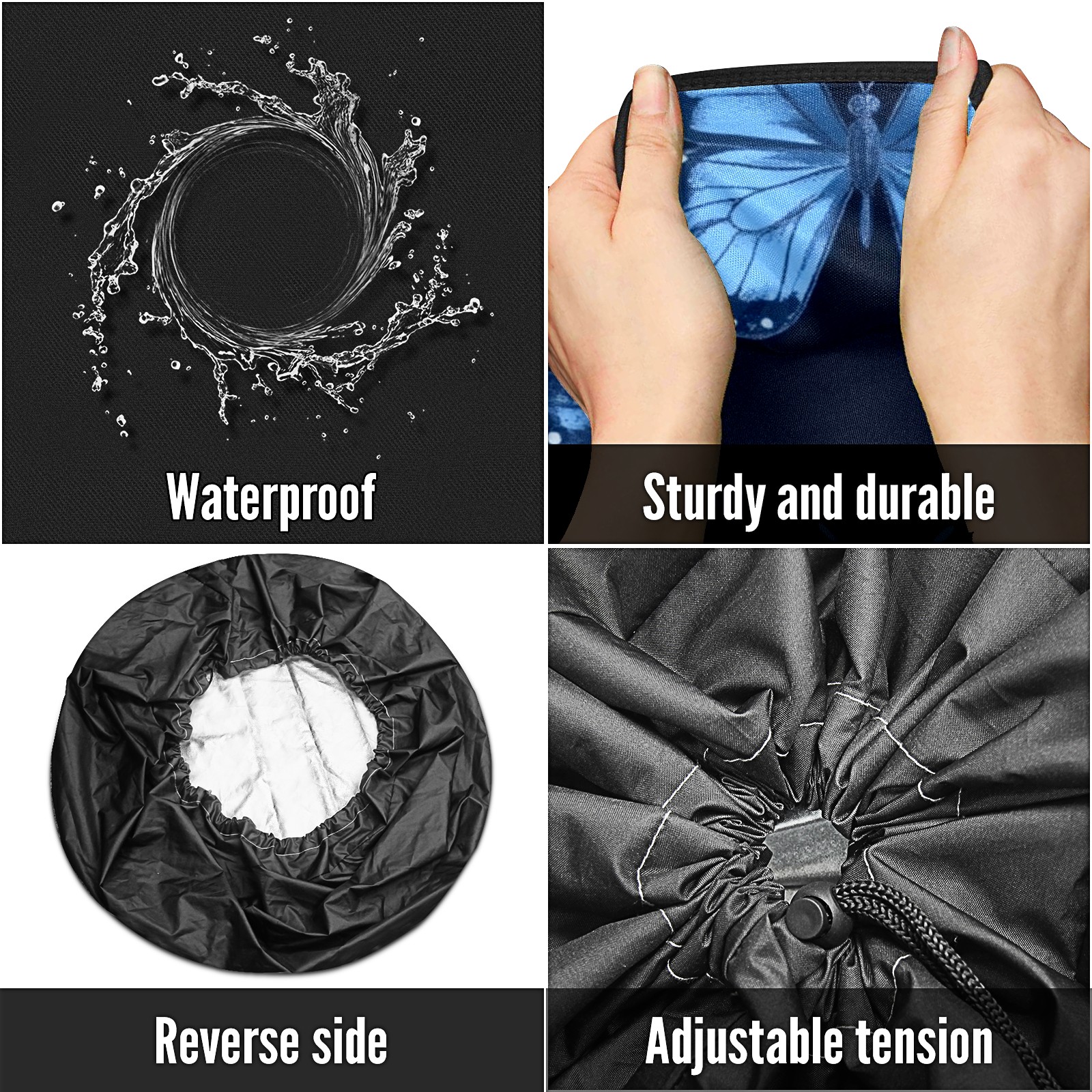 • <p>Keep your spare tire protected and your vehicle looking sharp with our universal Tire Cover. Designed with a sleek single-sided print and classic black sides, this rugged cover is made from high-quality polyester fabric that is fully waterproof. The adjustable nylon rope ensures a secure, custom fit for any tire, helping to maintain a clean and professional appearance for your vehicle.</p>