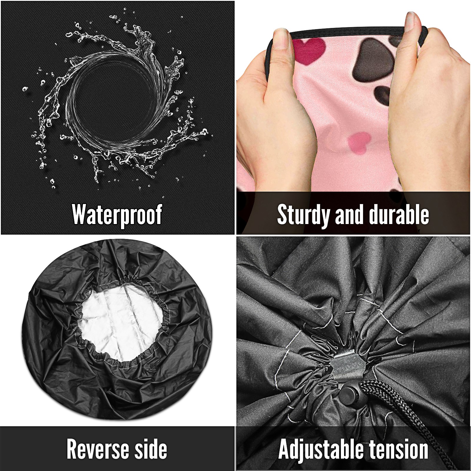 • <p>Keep your spare tire protected and your vehicle looking sharp with our universal Tire Cover. Designed with a sleek single-sided print and classic black sides, this rugged cover is made from high-quality polyester fabric that is fully waterproof. The adjustable nylon rope ensures a secure, custom fit for any tire, helping to maintain a clean and professional appearance for your vehicle.</p>