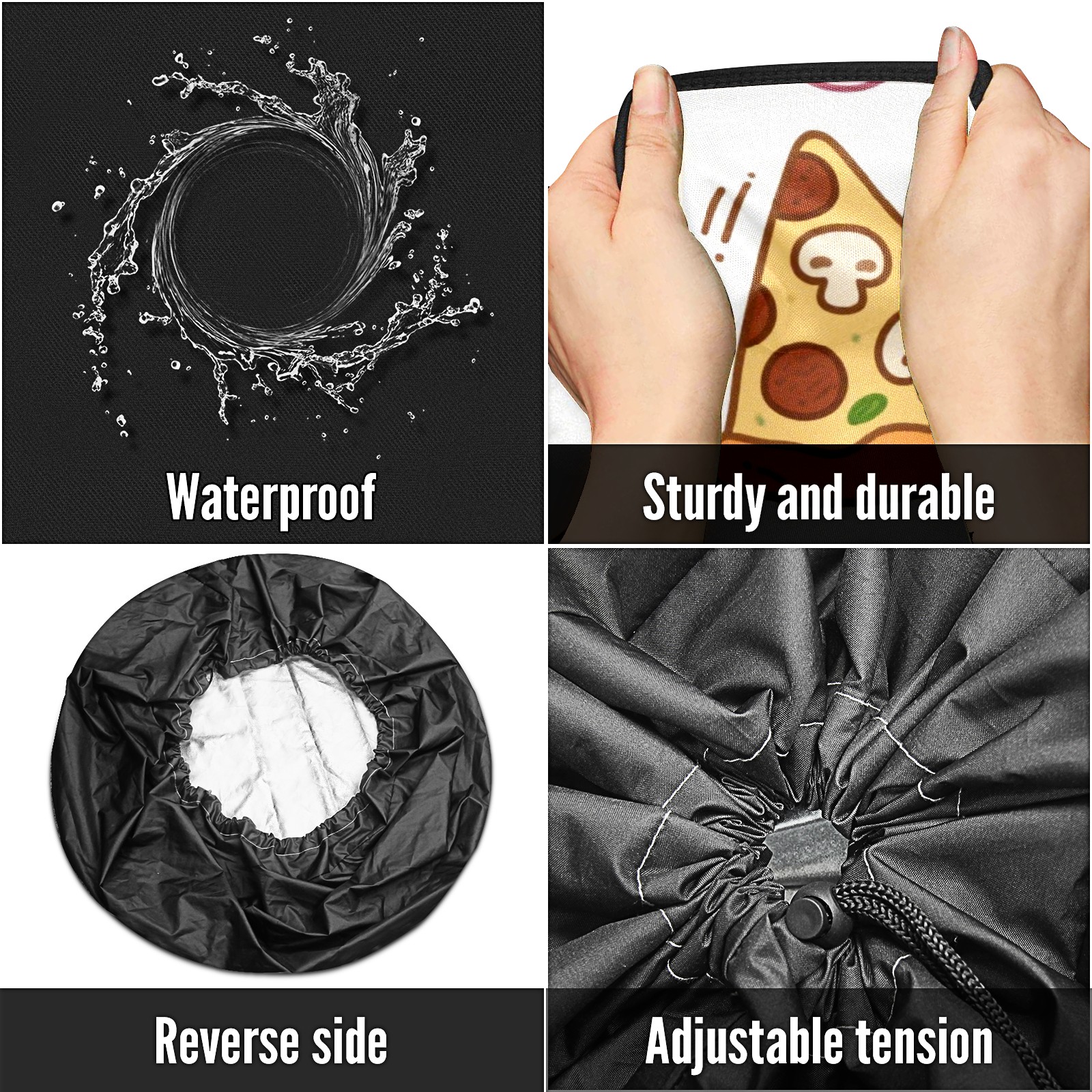 • <p>Keep your spare tire protected and your vehicle looking sharp with our universal Tire Cover. Designed with a sleek single-sided print and classic black sides, this rugged cover is made from high-quality polyester fabric that is fully waterproof. The adjustable nylon rope ensures a secure, custom fit for any tire, helping to maintain a clean and professional appearance for your vehicle.</p>