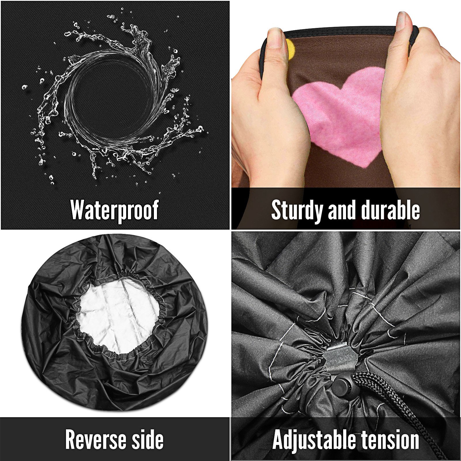 • <p>Keep your spare tire protected and your vehicle looking sharp with our universal Tire Cover. Designed with a sleek single-sided print and classic black sides, this rugged cover is made from high-quality polyester fabric that is fully waterproof. The adjustable nylon rope ensures a secure, custom fit for any tire, helping to maintain a clean and professional appearance for your vehicle.</p>