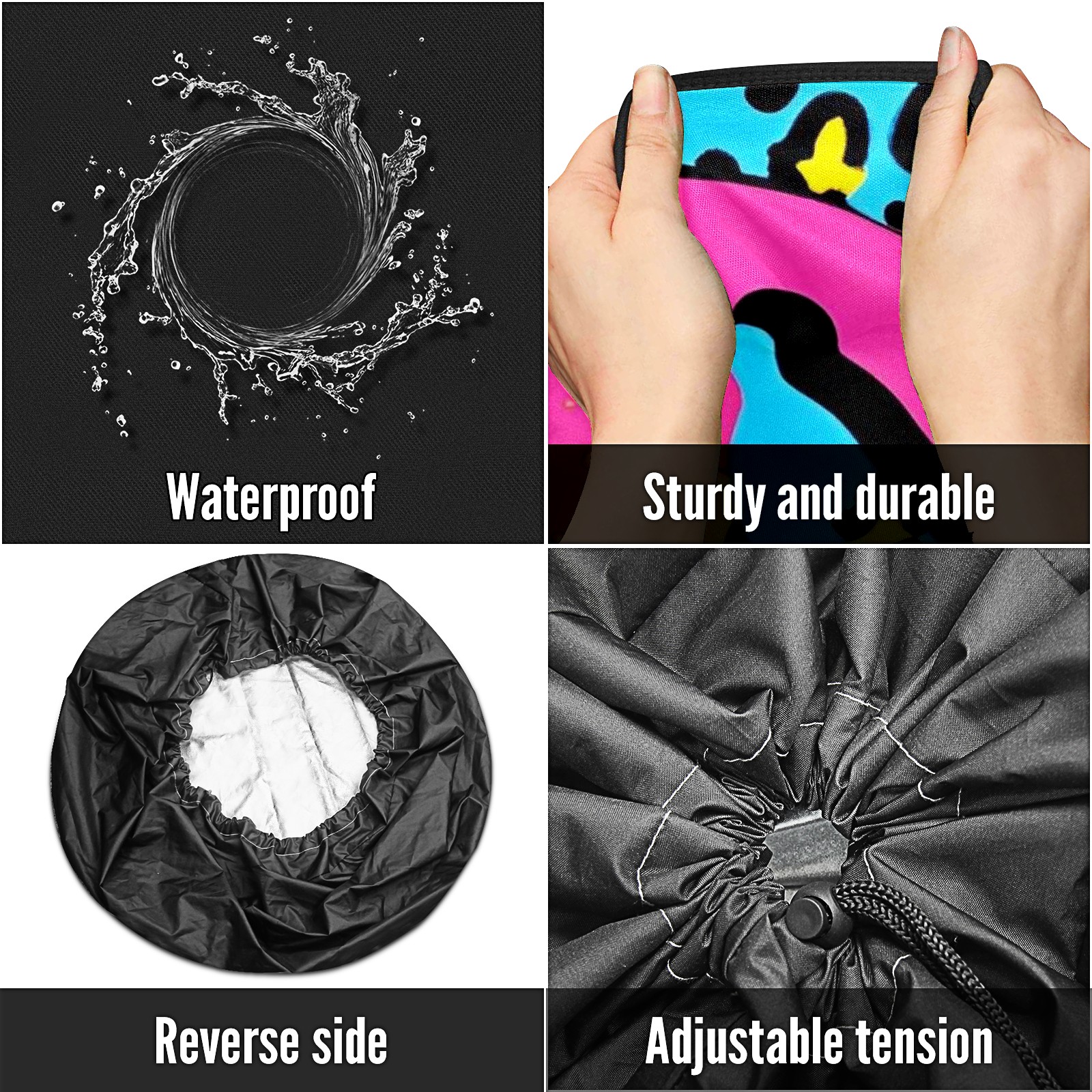 • <p>Keep your spare tire protected and your vehicle looking sharp with our universal Tire Cover. Designed with a sleek single-sided print and classic black sides, this rugged cover is made from high-quality polyester fabric that is fully waterproof. The adjustable nylon rope ensures a secure, custom fit for any tire, helping to maintain a clean and professional appearance for your vehicle.</p>