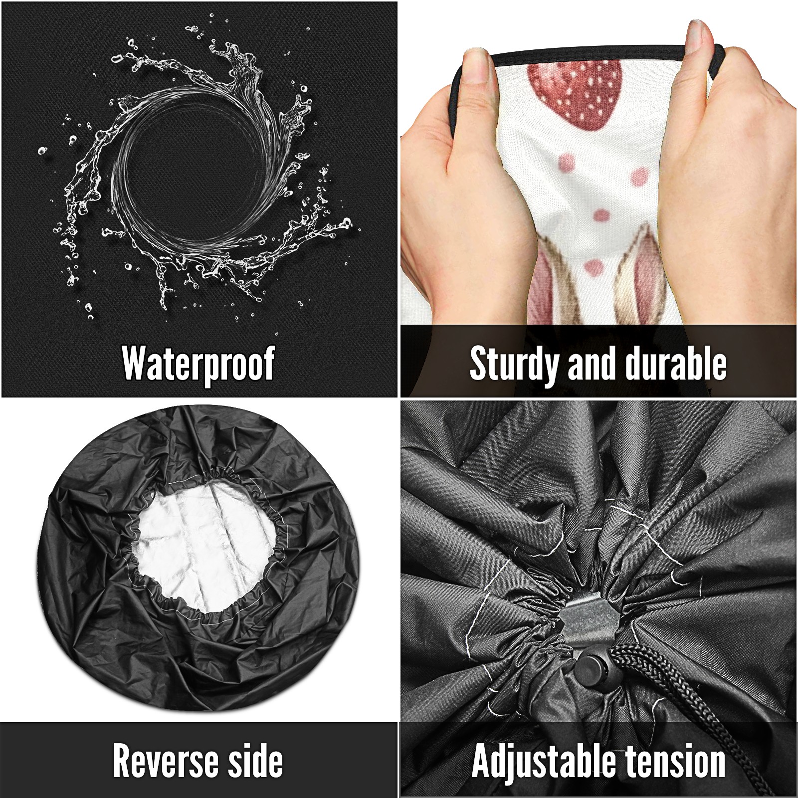 • <p>Keep your spare tire protected and your vehicle looking sharp with our universal Tire Cover. Designed with a sleek single-sided print and classic black sides, this rugged cover is made from high-quality polyester fabric that is fully waterproof. The adjustable nylon rope ensures a secure, custom fit for any tire, helping to maintain a clean and professional appearance for your vehicle.</p>
