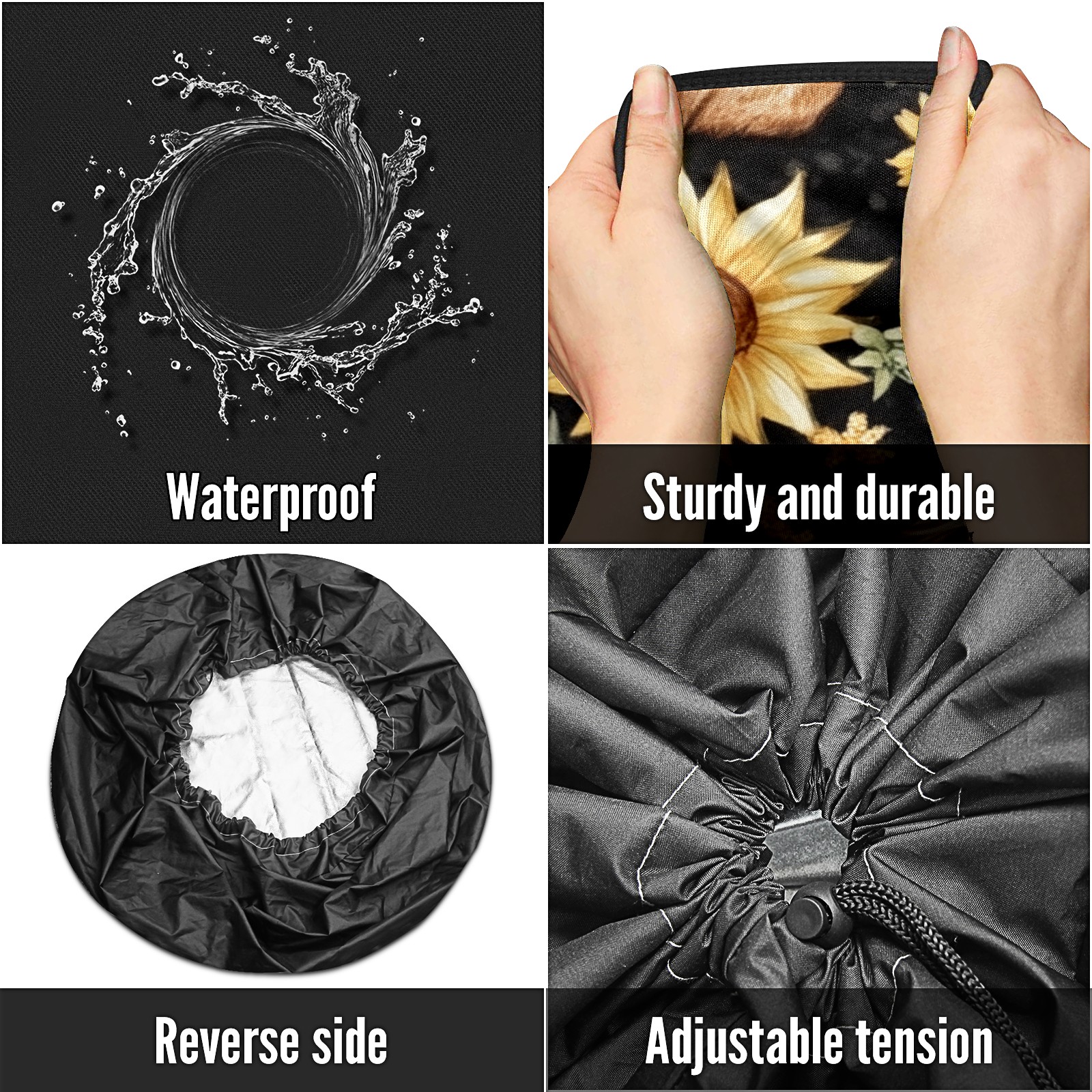 • <p>Keep your spare tire protected and your vehicle looking sharp with our universal Tire Cover. Designed with a sleek single-sided print and classic black sides, this rugged cover is made from high-quality polyester fabric that is fully waterproof. The adjustable nylon rope ensures a secure, custom fit for any tire, helping to maintain a clean and professional appearance for your vehicle.</p>