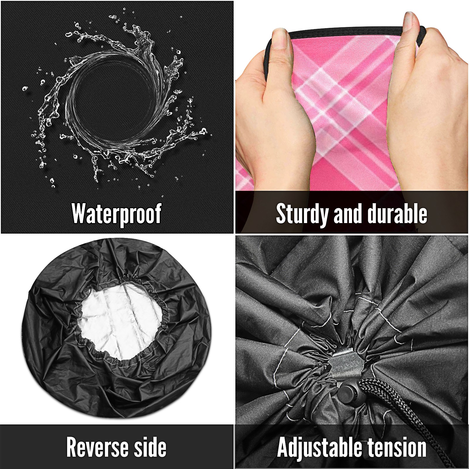 • <p>Keep your spare tire protected and your vehicle looking sharp with our universal Tire Cover. Designed with a sleek single-sided print and classic black sides, this rugged cover is made from high-quality polyester fabric that is fully waterproof. The adjustable nylon rope ensures a secure, custom fit for any tire, helping to maintain a clean and professional appearance for your vehicle.</p>