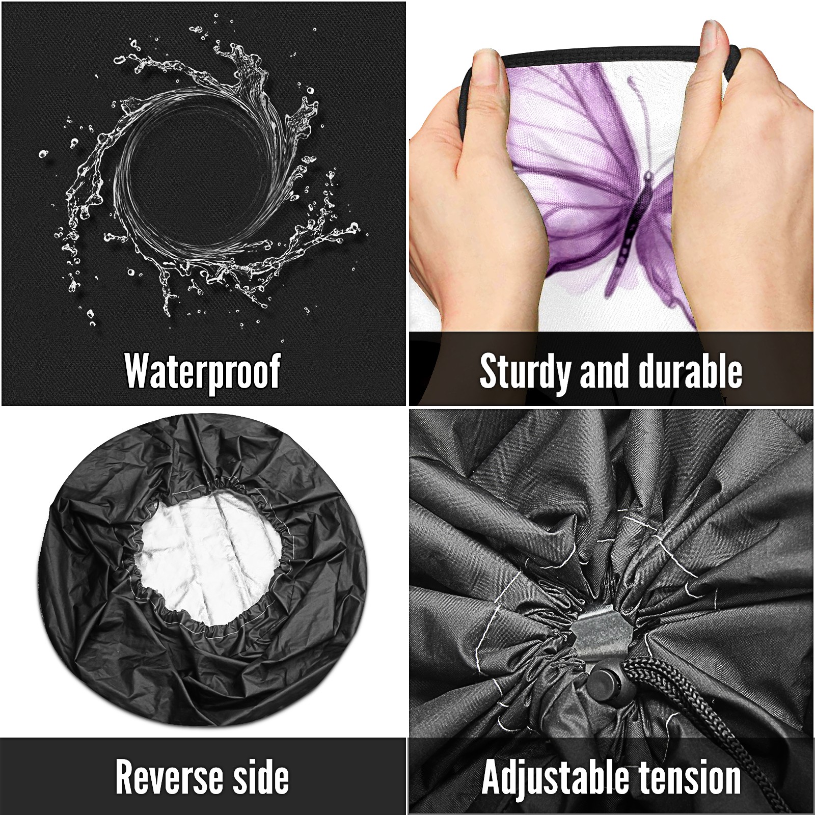 • <p>Keep your spare tire protected and your vehicle looking sharp with our universal Tire Cover. Designed with a sleek single-sided print and classic black sides, this rugged cover is made from high-quality polyester fabric that is fully waterproof. The adjustable nylon rope ensures a secure, custom fit for any tire, helping to maintain a clean and professional appearance for your vehicle.</p>