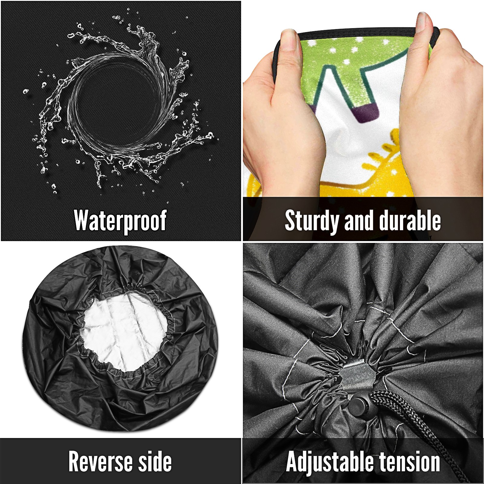 • <p>Keep your spare tire protected and your vehicle looking sharp with our universal Tire Cover. Designed with a sleek single-sided print and classic black sides, this rugged cover is made from high-quality polyester fabric that is fully waterproof. The adjustable nylon rope ensures a secure, custom fit for any tire, helping to maintain a clean and professional appearance for your vehicle.</p>
