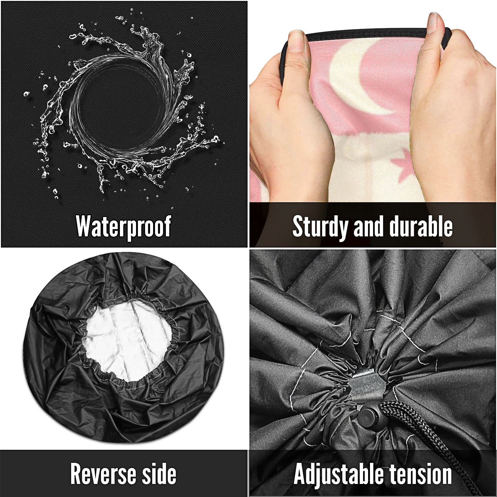 • <p>Keep your spare tire protected and your vehicle looking sharp with our universal Tire Cover. Designed with a sleek single-sided print and classic black sides, this rugged cover is made from high-quality polyester fabric that is fully waterproof. The adjustable nylon rope ensures a secure, custom fit for any tire, helping to maintain a clean and professional appearance for your vehicle.</p>
