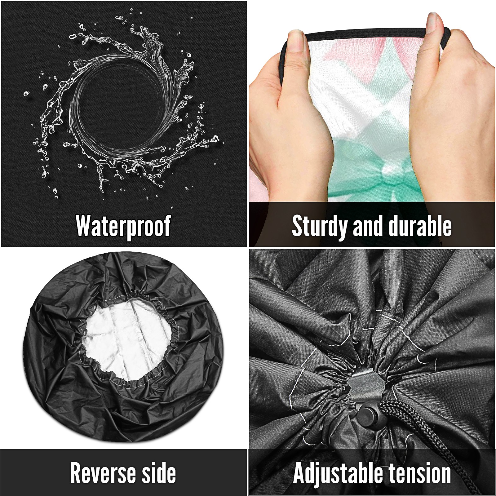 • <p>Keep your spare tire protected and your vehicle looking sharp with our universal Tire Cover. Designed with a sleek single-sided print and classic black sides, this rugged cover is made from high-quality polyester fabric that is fully waterproof. The adjustable nylon rope ensures a secure, custom fit for any tire, helping to maintain a clean and professional appearance for your vehicle.</p>