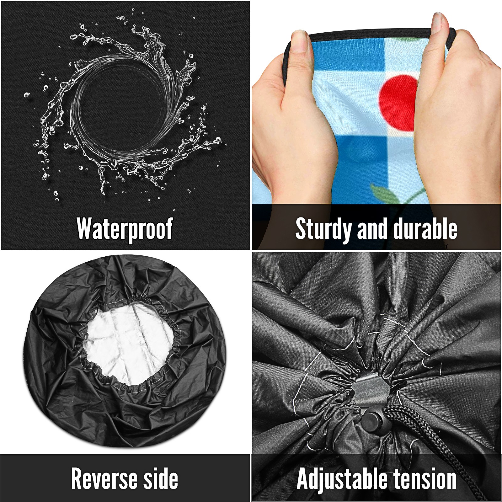 • <p>Keep your spare tire protected and your vehicle looking sharp with our universal Tire Cover. Designed with a sleek single-sided print and classic black sides, this rugged cover is made from high-quality polyester fabric that is fully waterproof. The adjustable nylon rope ensures a secure, custom fit for any tire, helping to maintain a clean and professional appearance for your vehicle.</p>