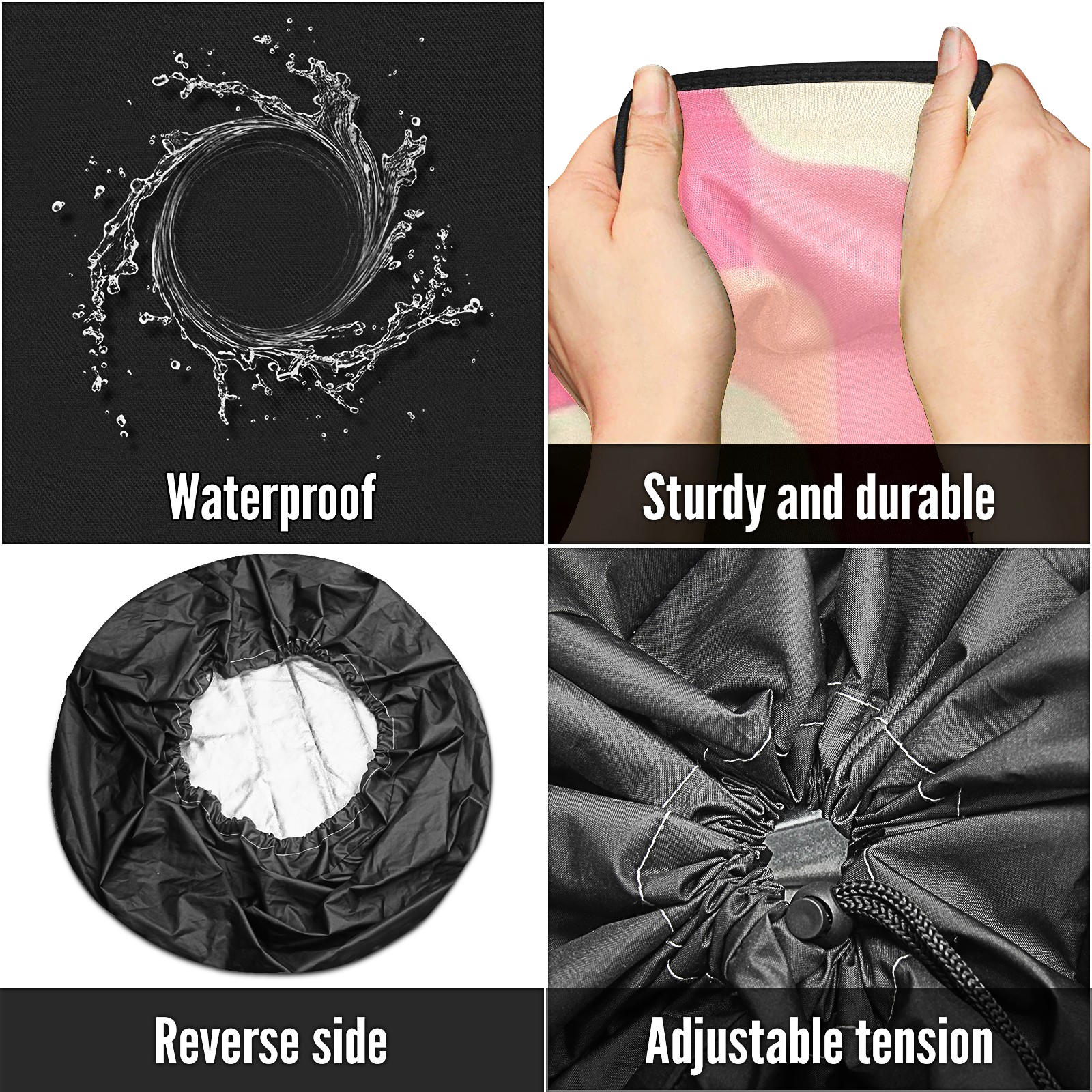 • <p>Keep your spare tire protected and your vehicle looking sharp with our universal Tire Cover. Designed with a sleek single-sided print and classic black sides, this rugged cover is made from high-quality polyester fabric that is fully waterproof. The adjustable nylon rope ensures a secure, custom fit for any tire, helping to maintain a clean and professional appearance for your vehicle.</p>