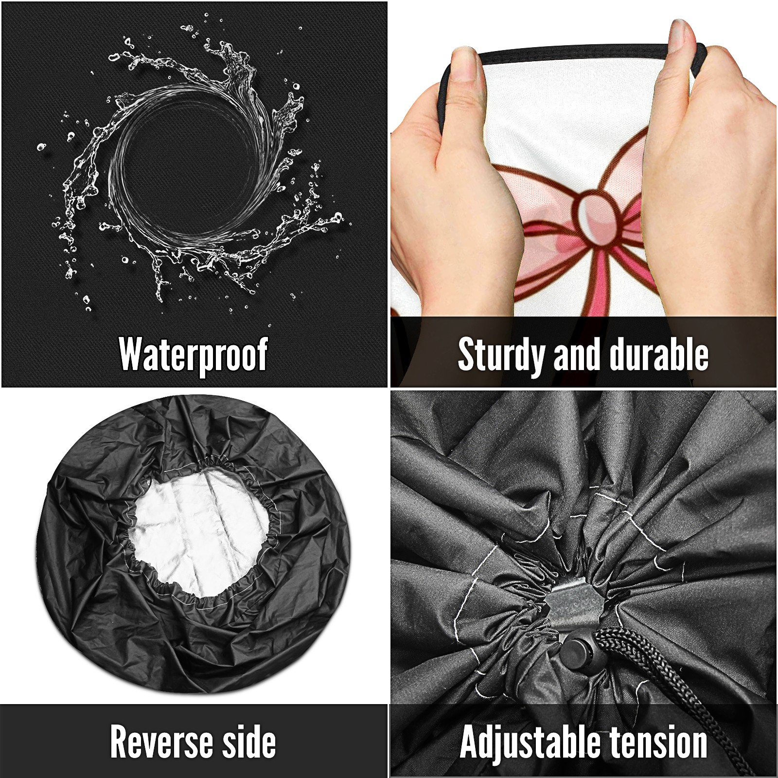• <p>Keep your spare tire protected and your vehicle looking sharp with our universal Tire Cover. Designed with a sleek single-sided print and classic black sides, this rugged cover is made from high-quality polyester fabric that is fully waterproof. The adjustable nylon rope ensures a secure, custom fit for any tire, helping to maintain a clean and professional appearance for your vehicle.</p>