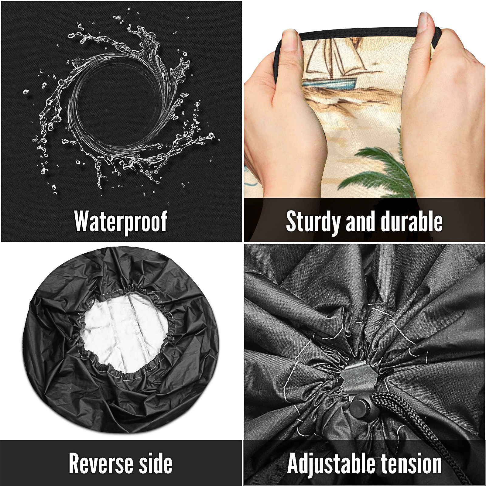 • <p>Keep your spare tire protected and your vehicle looking sharp with our universal Tire Cover. Designed with a sleek single-sided print and classic black sides, this rugged cover is made from high-quality polyester fabric that is fully waterproof. The adjustable nylon rope ensures a secure, custom fit for any tire, helping to maintain a clean and professional appearance for your vehicle.</p>