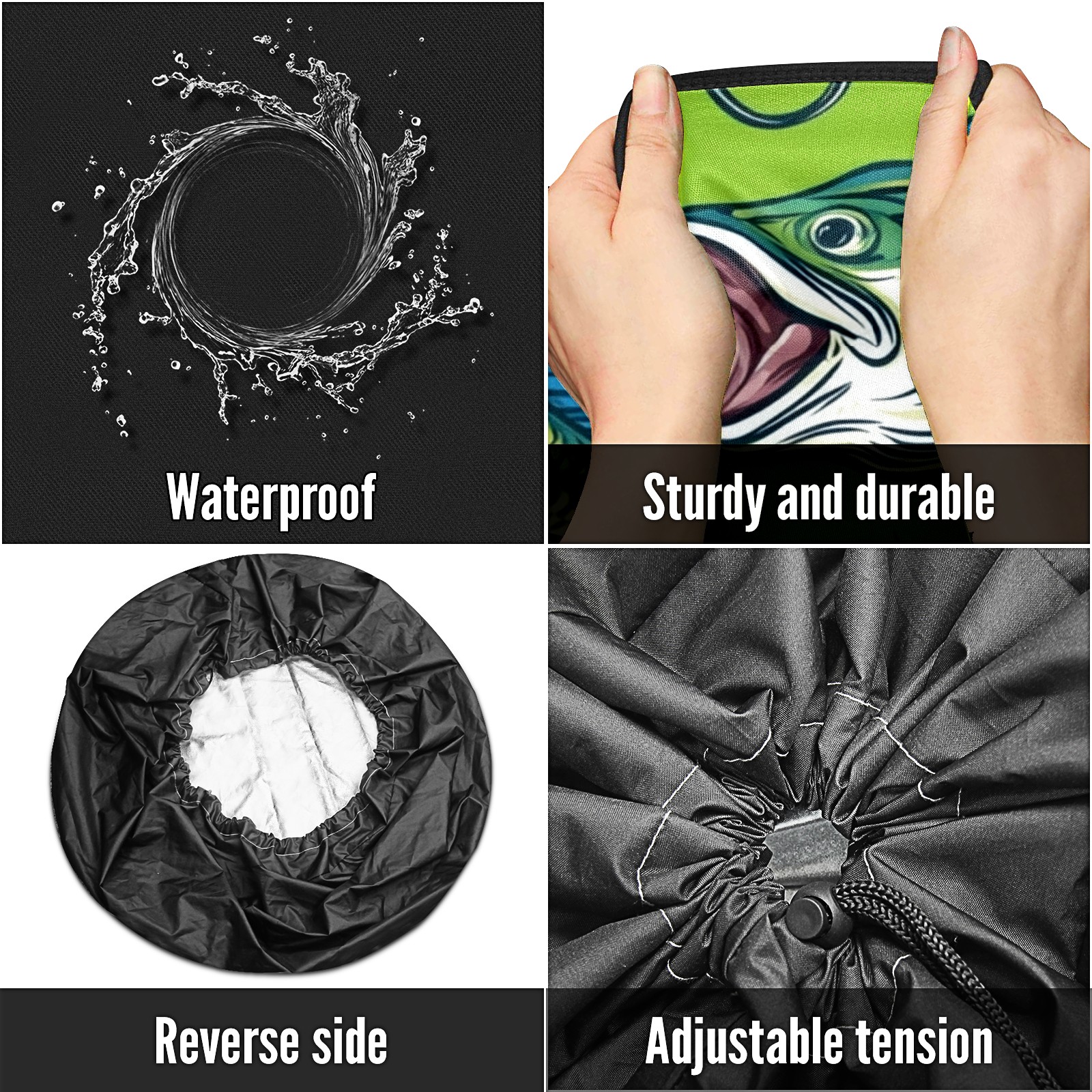 • <p>Keep your spare tire protected and your vehicle looking sharp with our universal Tire Cover. Designed with a sleek single-sided print and classic black sides, this rugged cover is made from high-quality polyester fabric that is fully waterproof. The adjustable nylon rope ensures a secure, custom fit for any tire, helping to maintain a clean and professional appearance for your vehicle.</p>