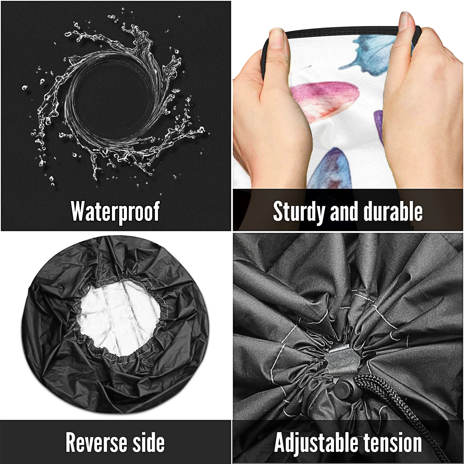 • <p>Keep your spare tire protected and your vehicle looking sharp with our universal Tire Cover. Designed with a sleek single-sided print and classic black sides, this rugged cover is made from high-quality polyester fabric that is fully waterproof. The adjustable nylon rope ensures a secure, custom fit for any tire, helping to maintain a clean and professional appearance for your vehicle.</p>