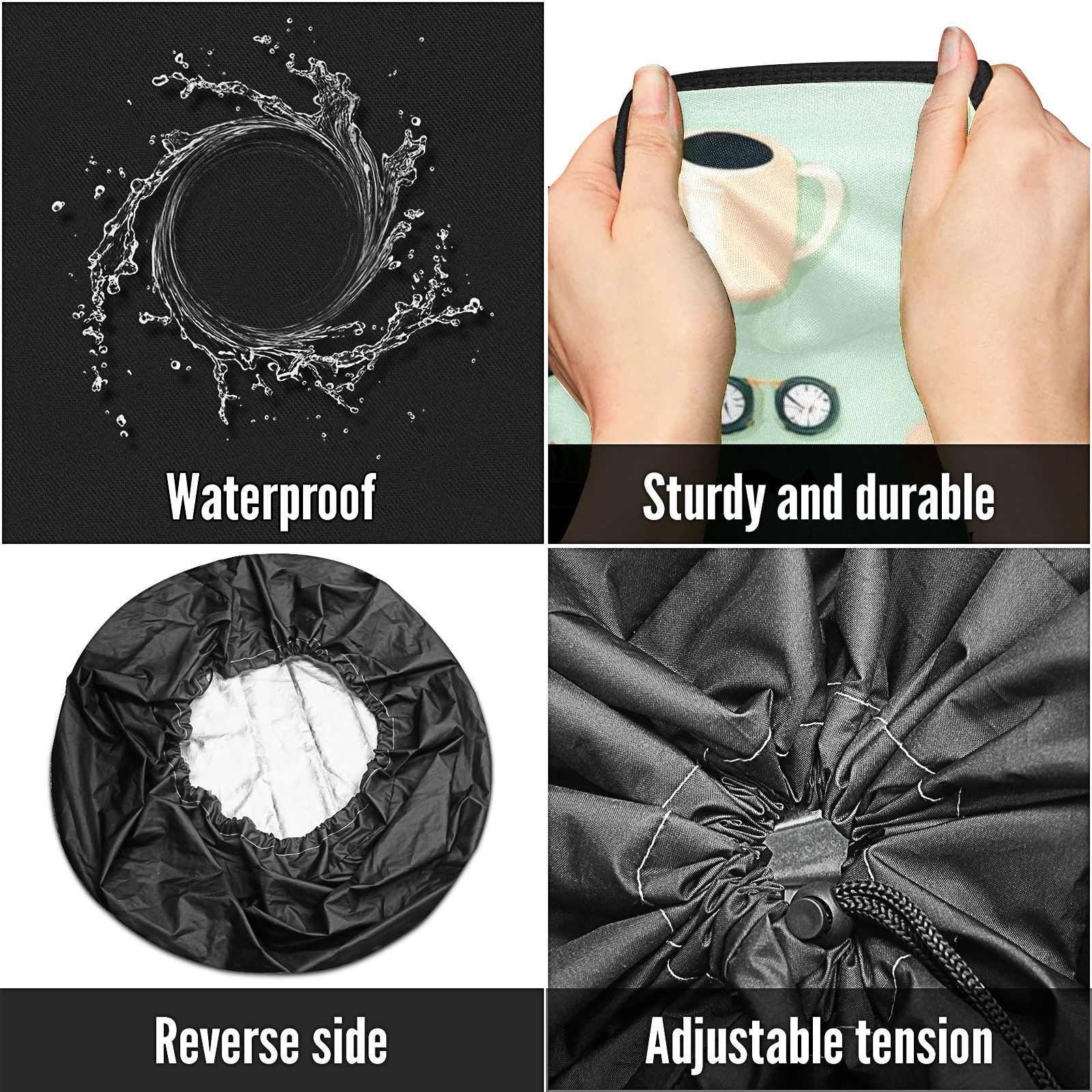 • <p>Keep your spare tire protected and your vehicle looking sharp with our universal Tire Cover. Designed with a sleek single-sided print and classic black sides, this rugged cover is made from high-quality polyester fabric that is fully waterproof. The adjustable nylon rope ensures a secure, custom fit for any tire, helping to maintain a clean and professional appearance for your vehicle.</p>