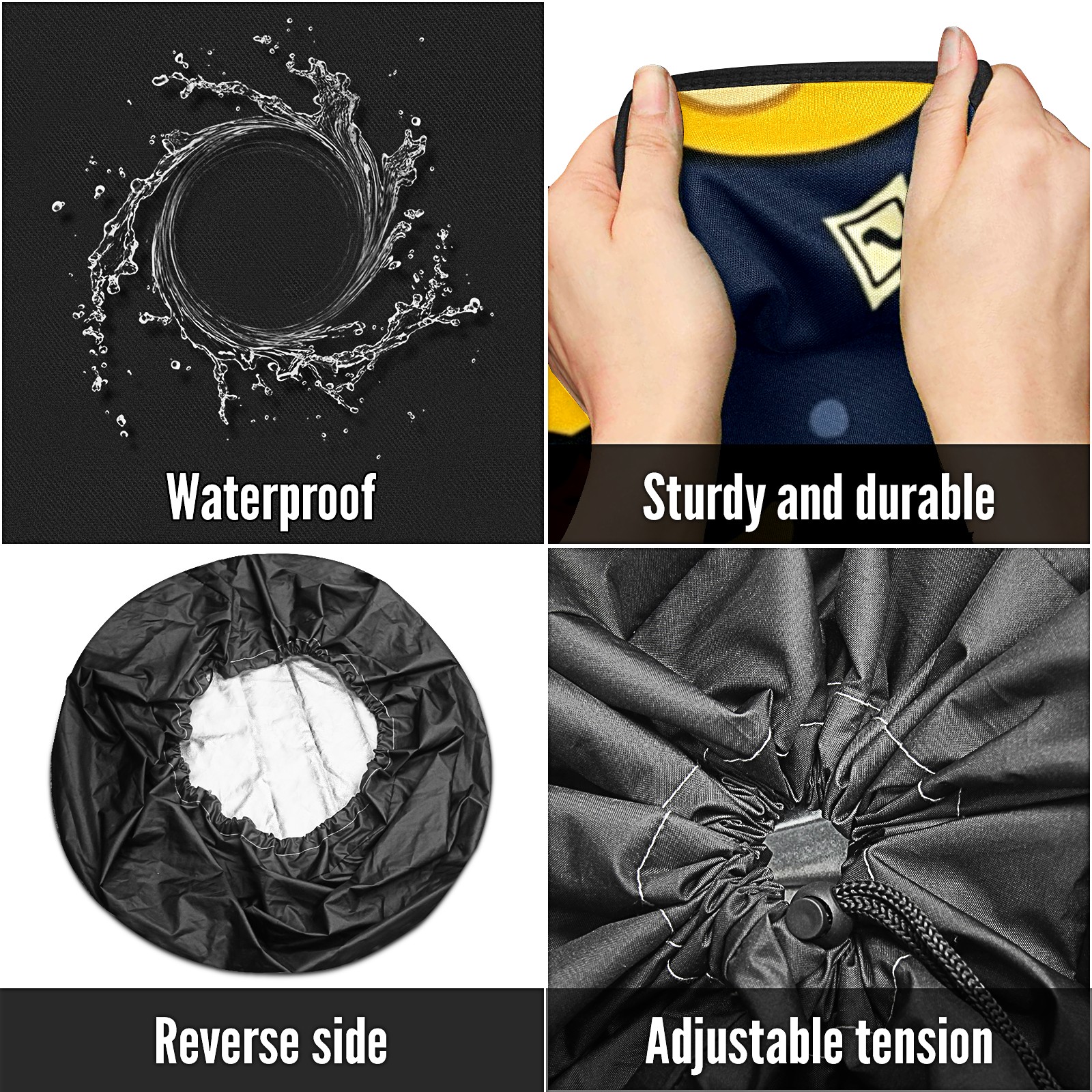 • <p>Keep your spare tire protected and your vehicle looking sharp with our universal Tire Cover. Designed with a sleek single-sided print and classic black sides, this rugged cover is made from high-quality polyester fabric that is fully waterproof. The adjustable nylon rope ensures a secure, custom fit for any tire, helping to maintain a clean and professional appearance for your vehicle.</p>