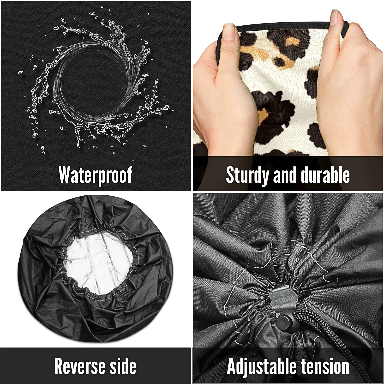• <p>Keep your spare tire protected and your vehicle looking sharp with our universal Tire Cover. Designed with a sleek single-sided print and classic black sides, this rugged cover is made from high-quality polyester fabric that is fully waterproof. The adjustable nylon rope ensures a secure, custom fit for any tire, helping to maintain a clean and professional appearance for your vehicle.</p>