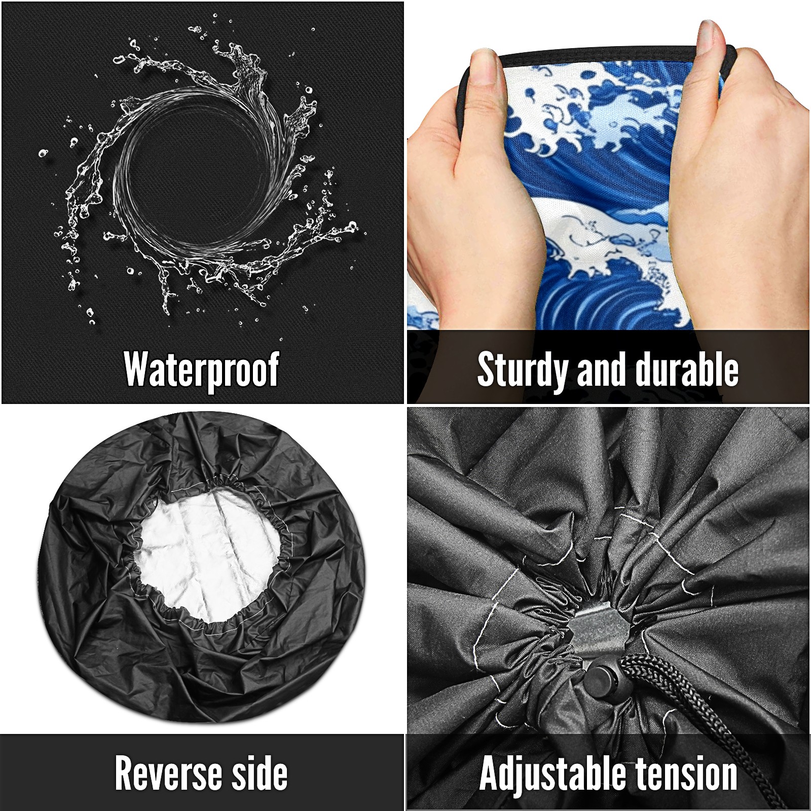 • <p>Keep your spare tire protected and your vehicle looking sharp with our universal Tire Cover. Designed with a sleek single-sided print and classic black sides, this rugged cover is made from high-quality polyester fabric that is fully waterproof. The adjustable nylon rope ensures a secure, custom fit for any tire, helping to maintain a clean and professional appearance for your vehicle.</p>