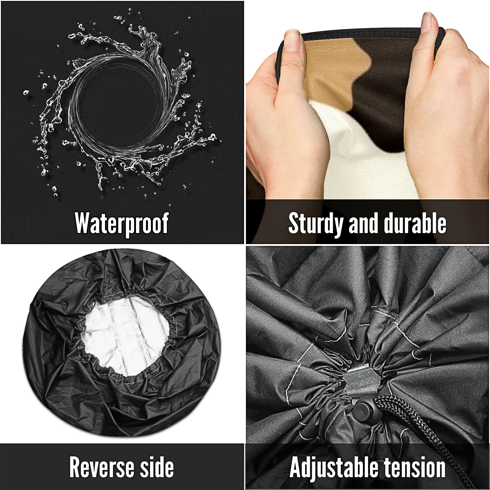 • <p>Keep your spare tire protected and your vehicle looking sharp with our universal Tire Cover. Designed with a sleek single-sided print and classic black sides, this rugged cover is made from high-quality polyester fabric that is fully waterproof. The adjustable nylon rope ensures a secure, custom fit for any tire, helping to maintain a clean and professional appearance for your vehicle.</p>