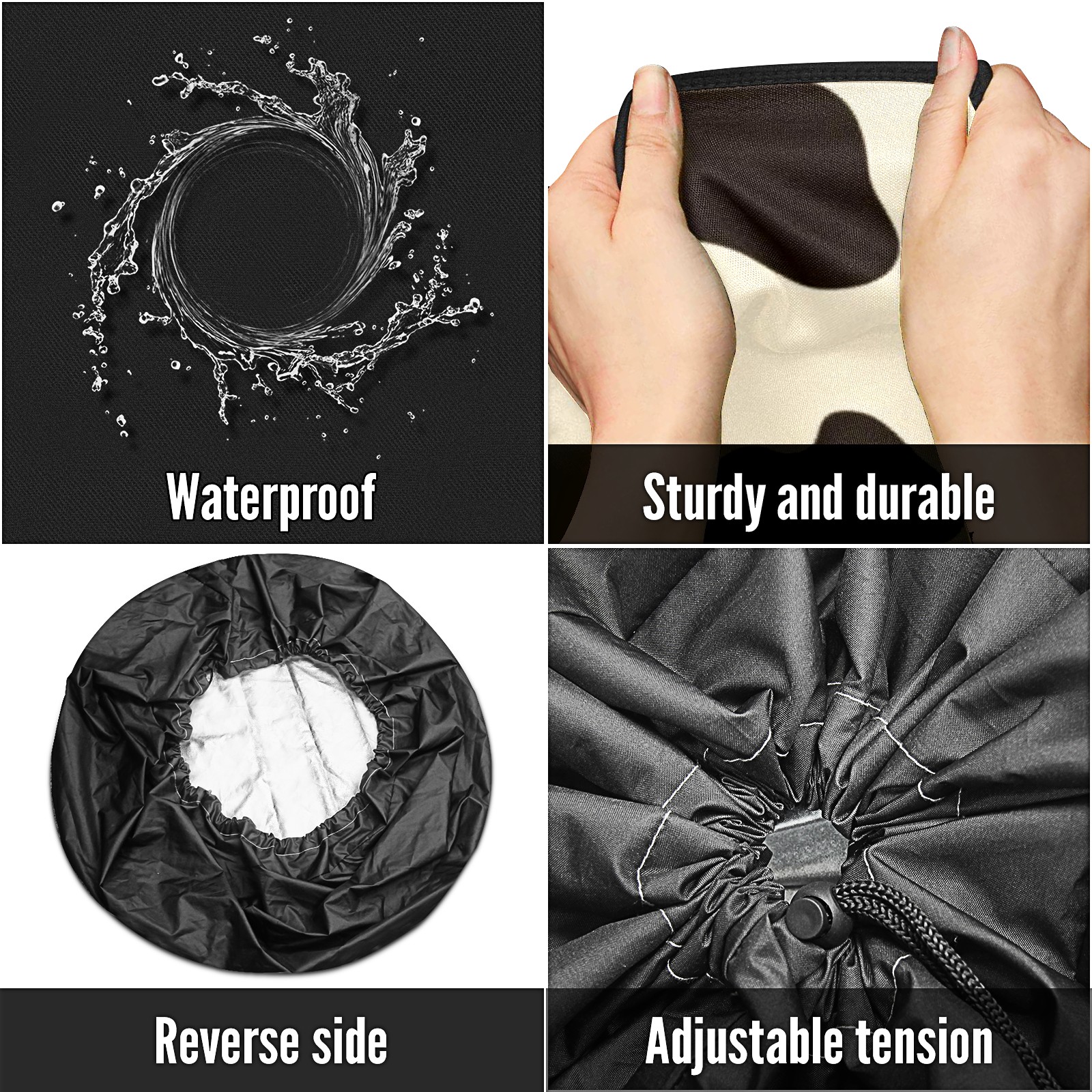 • <p>Keep your spare tire protected and your vehicle looking sharp with our universal Tire Cover. Designed with a sleek single-sided print and classic black sides, this rugged cover is made from high-quality polyester fabric that is fully waterproof. The adjustable nylon rope ensures a secure, custom fit for any tire, helping to maintain a clean and professional appearance for your vehicle.</p>