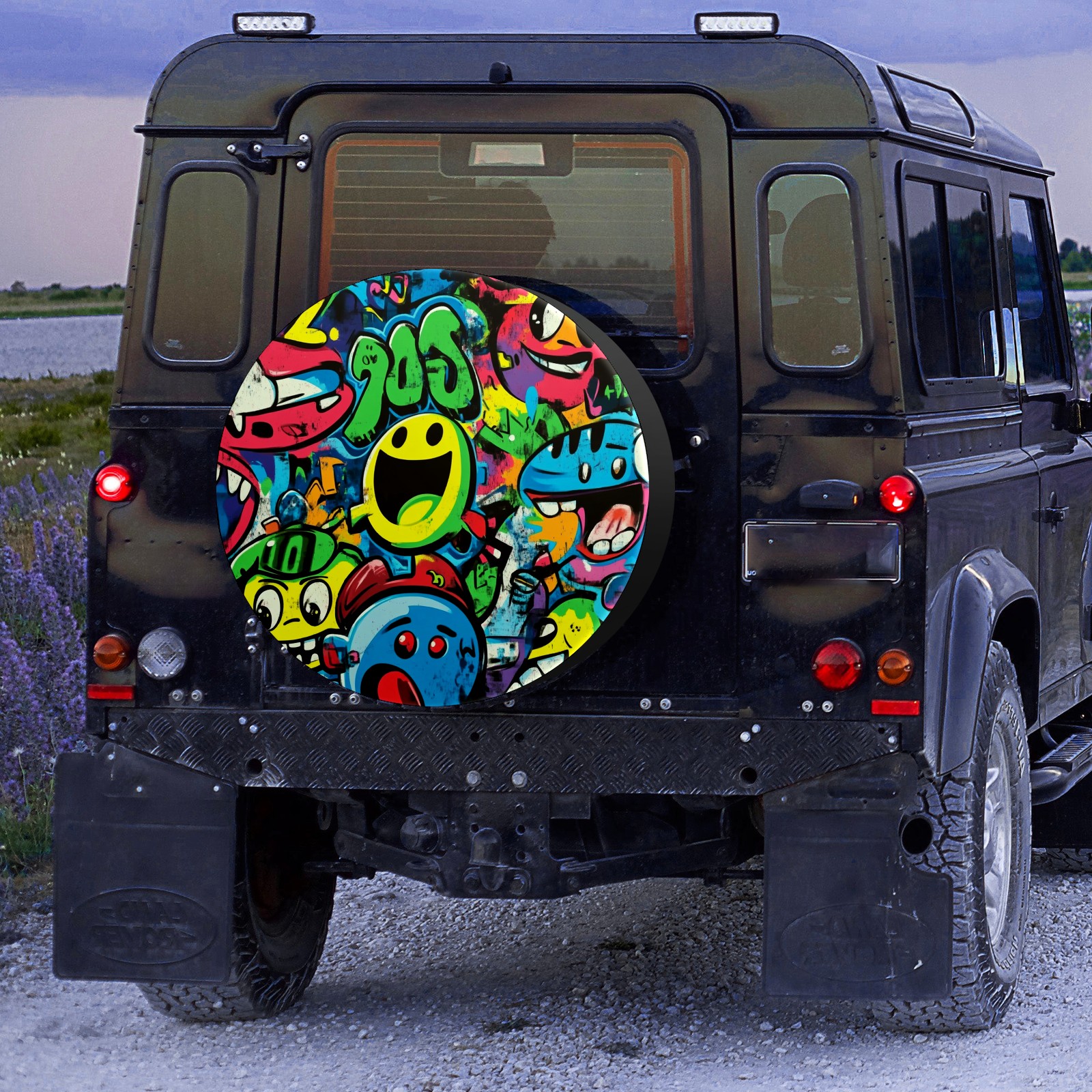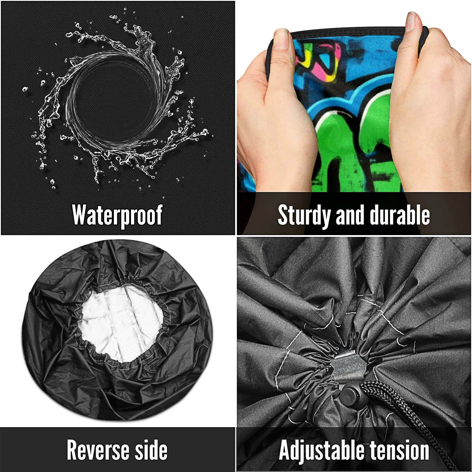 • <p>Keep your spare tire protected and your vehicle looking sharp with our universal Tire Cover. Designed with a sleek single-sided print and classic black sides, this rugged cover is made from high-quality polyester fabric that is fully waterproof. The adjustable nylon rope ensures a secure, custom fit for any tire, helping to maintain a clean and professional appearance for your vehicle.</p>