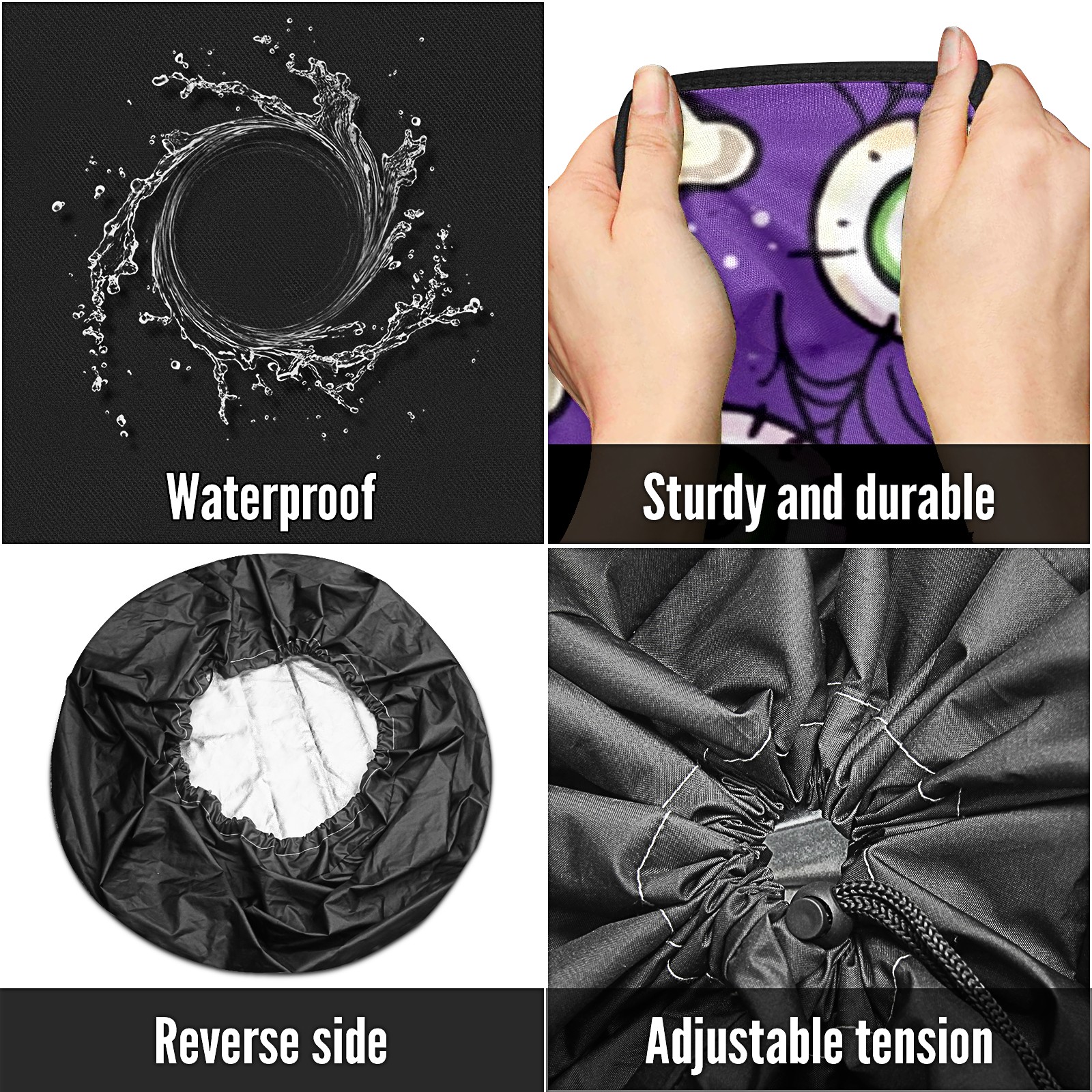 • <p>Keep your spare tire protected and your vehicle looking sharp with our universal Tire Cover. Designed with a sleek single-sided print and classic black sides, this rugged cover is made from high-quality polyester fabric that is fully waterproof. The adjustable nylon rope ensures a secure, custom fit for any tire, helping to maintain a clean and professional appearance for your vehicle.</p>