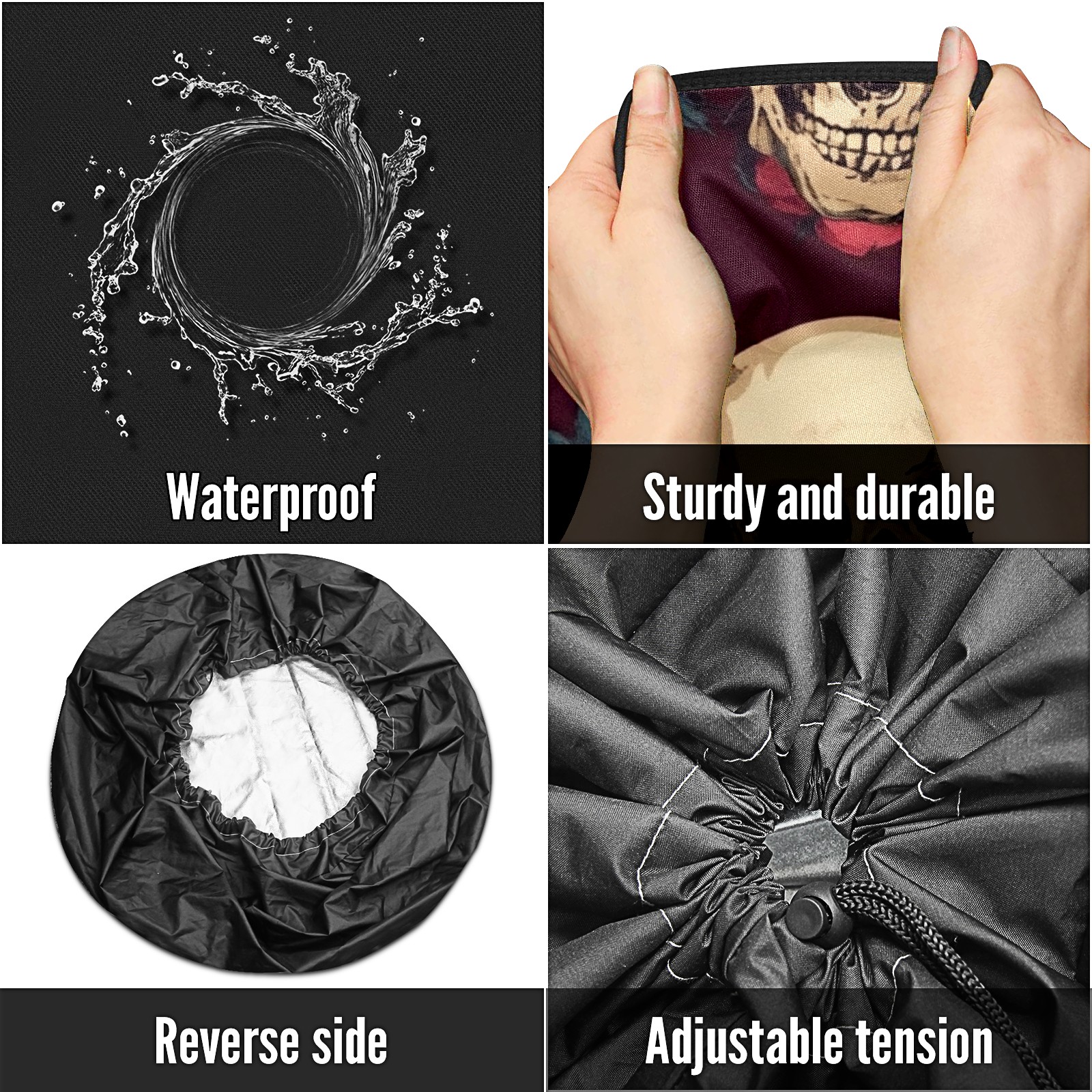 • <p>Keep your spare tire protected and your vehicle looking sharp with our universal Tire Cover. Designed with a sleek single-sided print and classic black sides, this rugged cover is made from high-quality polyester fabric that is fully waterproof. The adjustable nylon rope ensures a secure, custom fit for any tire, helping to maintain a clean and professional appearance for your vehicle.</p>