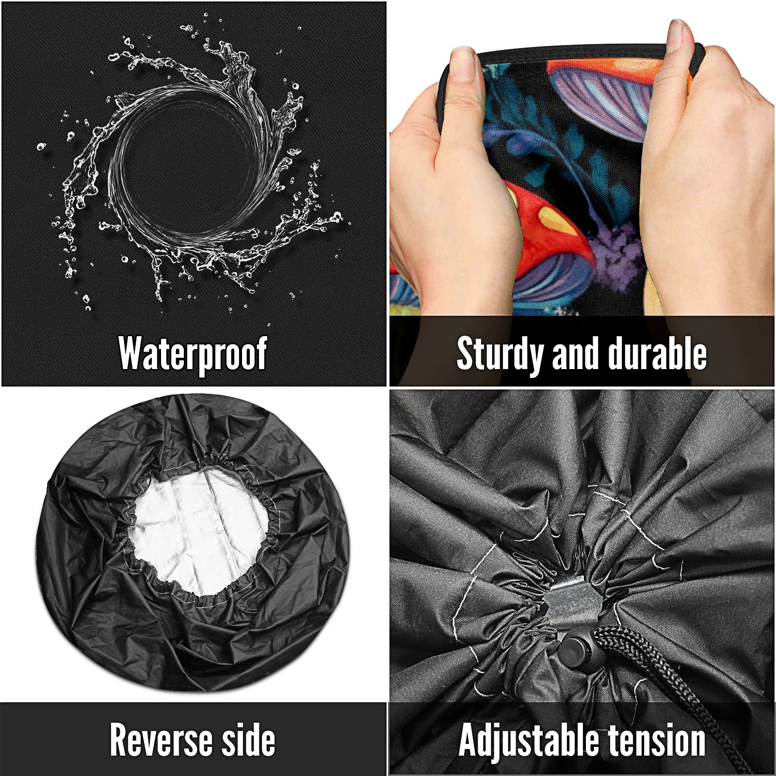 • <p>Keep your spare tire protected and your vehicle looking sharp with our universal Tire Cover. Designed with a sleek single-sided print and classic black sides, this rugged cover is made from high-quality polyester fabric that is fully waterproof. The adjustable nylon rope ensures a secure, custom fit for any tire, helping to maintain a clean and professional appearance for your vehicle.</p>