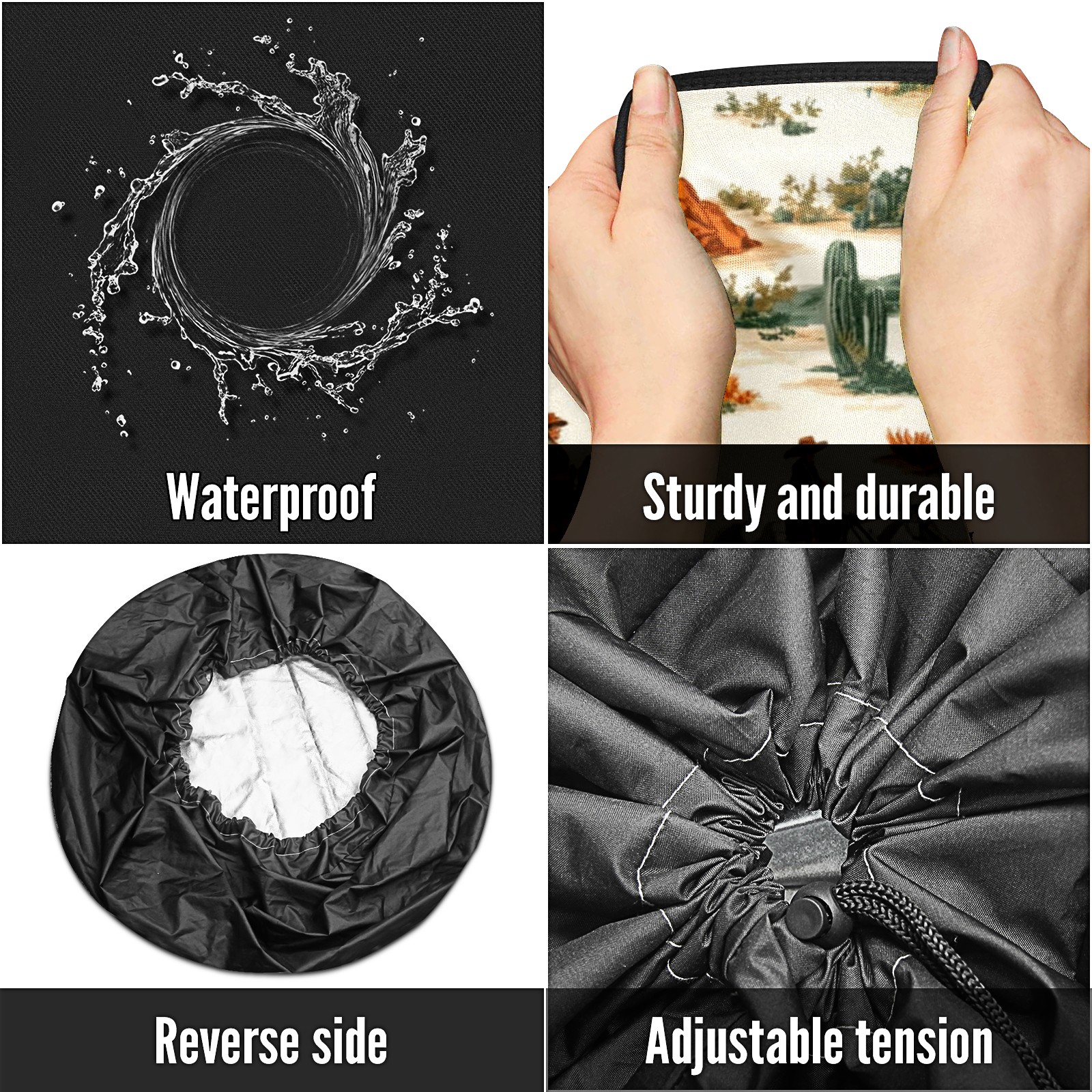 • <p>Keep your spare tire protected and your vehicle looking sharp with our universal Tire Cover. Designed with a sleek single-sided print and classic black sides, this rugged cover is made from high-quality polyester fabric that is fully waterproof. The adjustable nylon rope ensures a secure, custom fit for any tire, helping to maintain a clean and professional appearance for your vehicle.</p>