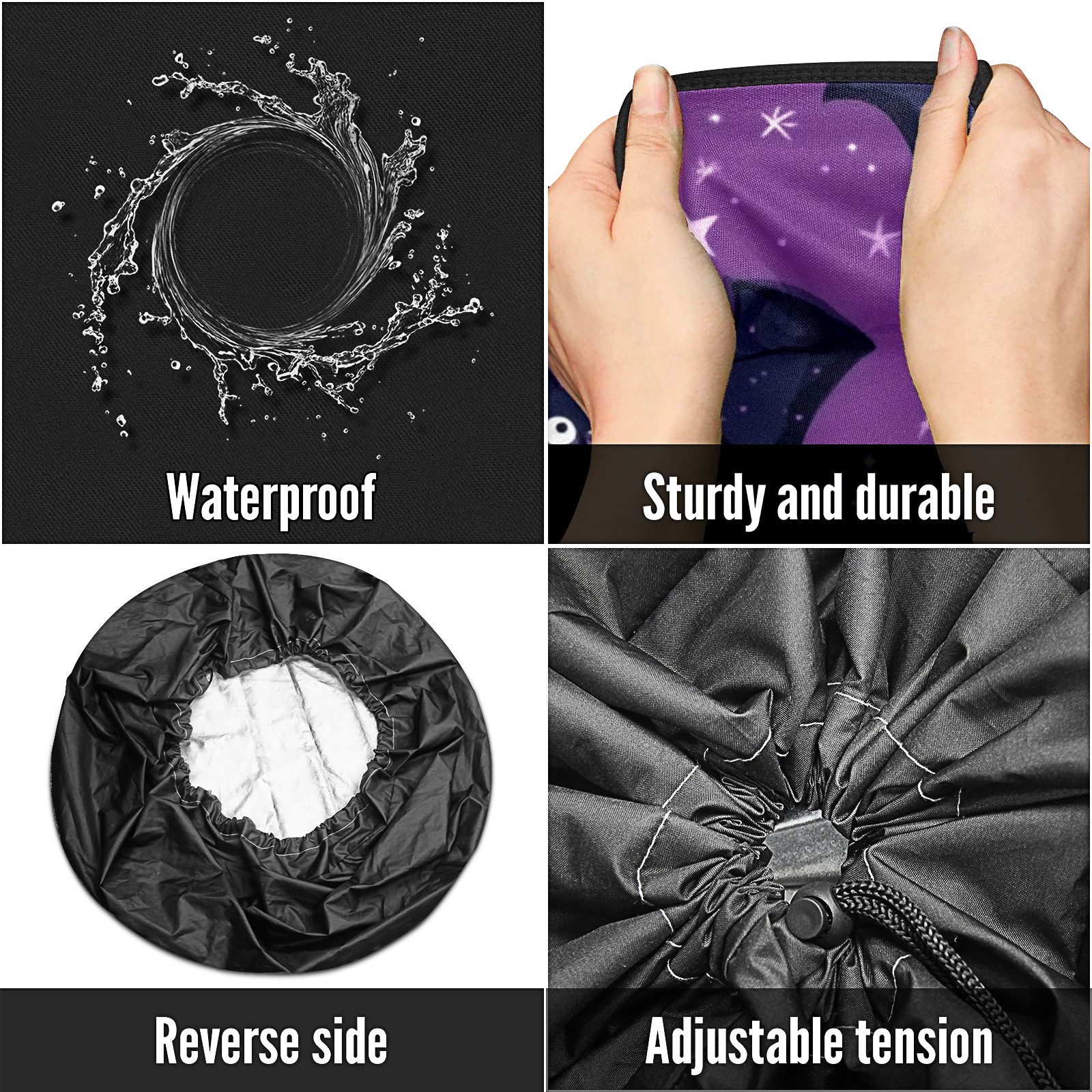 • <p>Keep your spare tire protected and your vehicle looking sharp with our universal Tire Cover. Designed with a sleek single-sided print and classic black sides, this rugged cover is made from high-quality polyester fabric that is fully waterproof. The adjustable nylon rope ensures a secure, custom fit for any tire, helping to maintain a clean and professional appearance for your vehicle.</p>