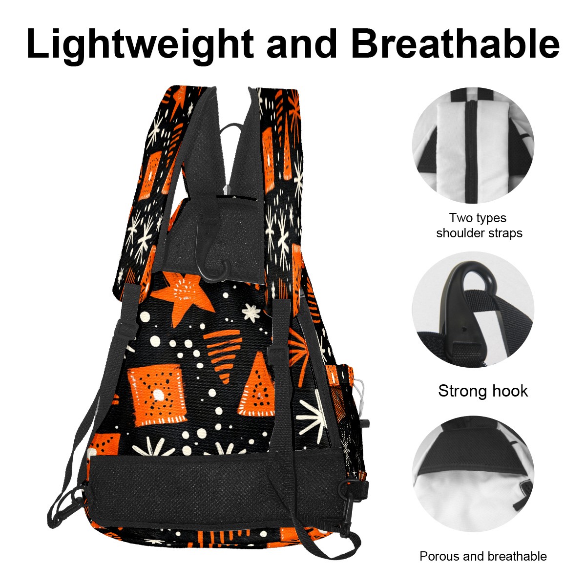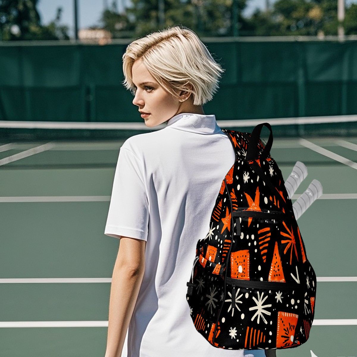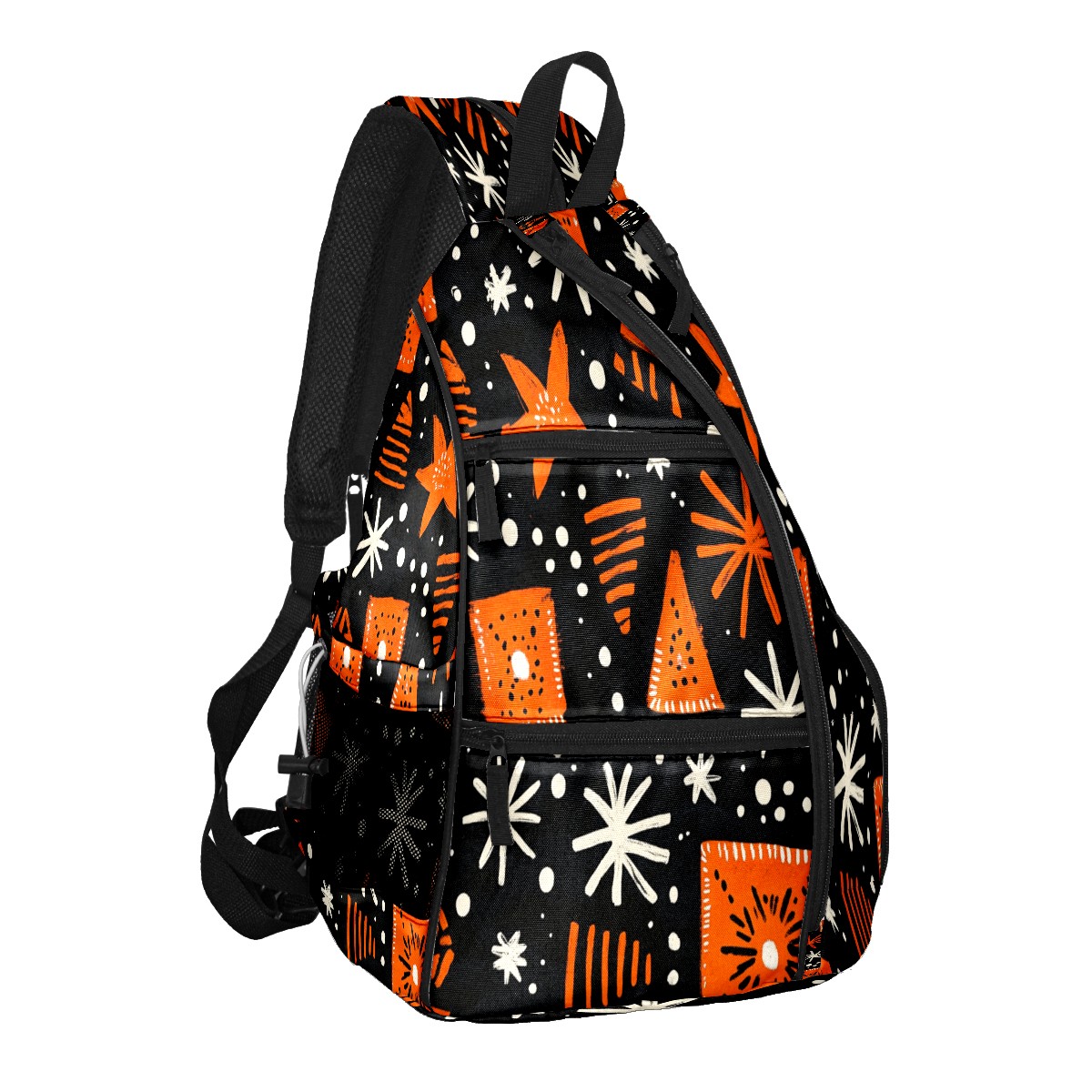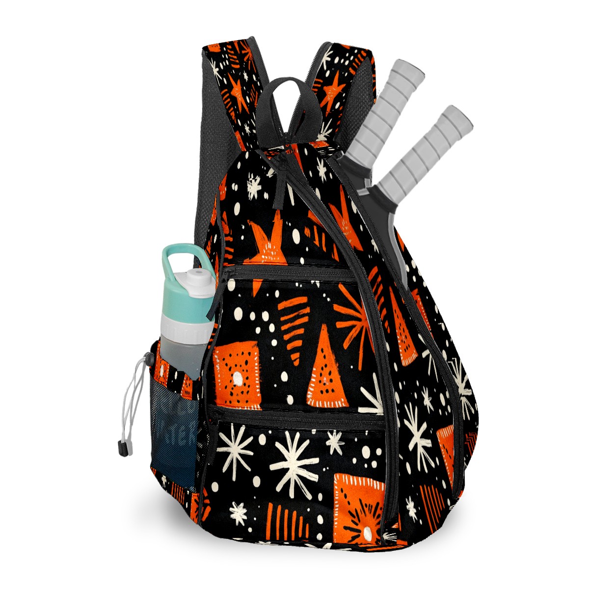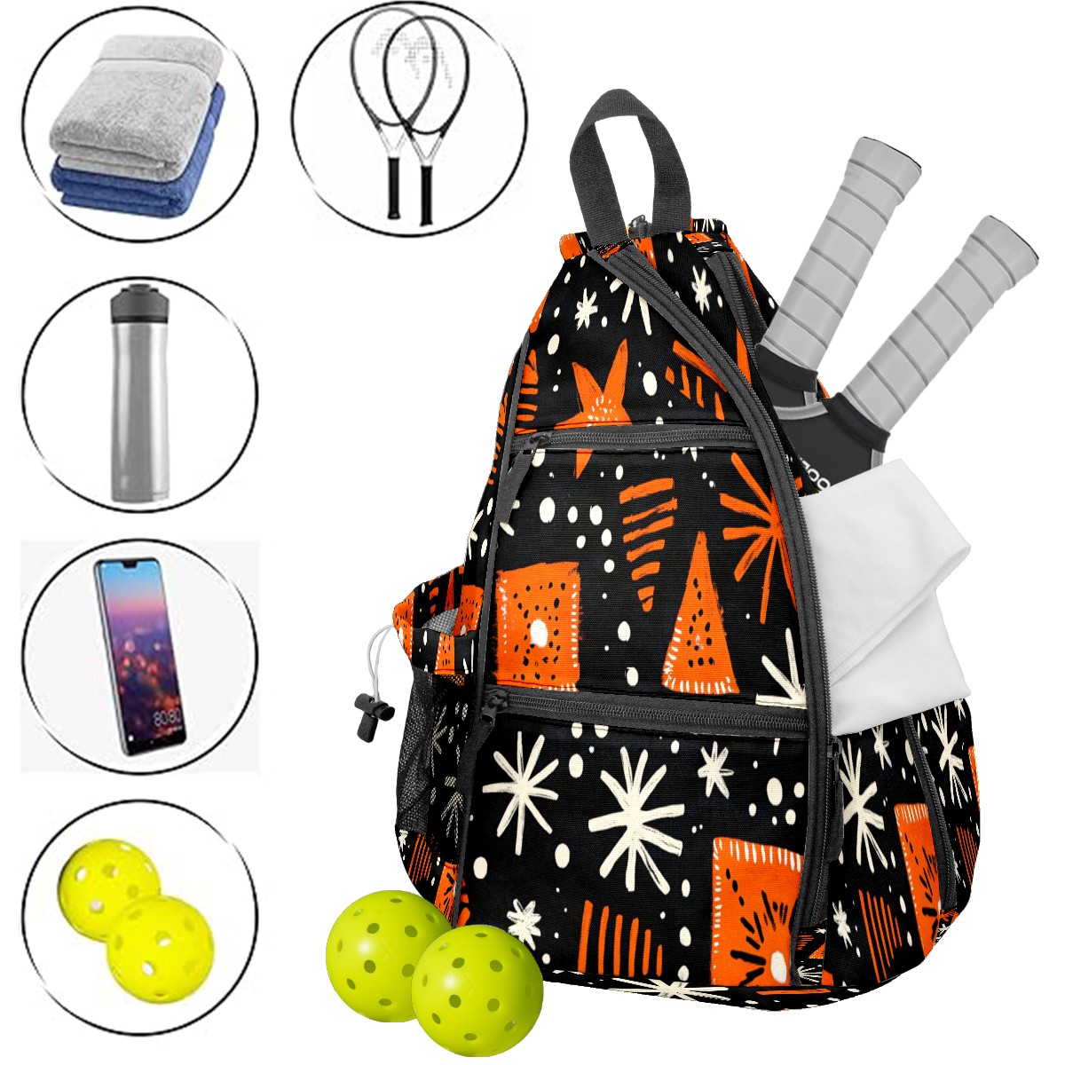 Pickleball Sling Bag for Women and Men - Backpack with Nylon Fabric/Woven Strap/Mesh Pocket/Fence Hook/Adjustable Bag Orange Black Traditional Pattern