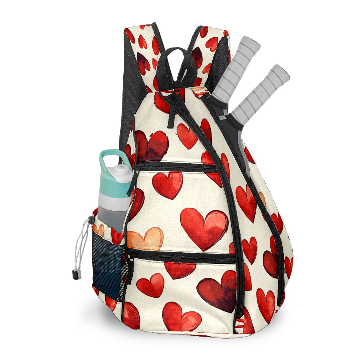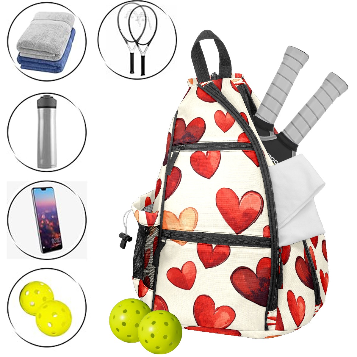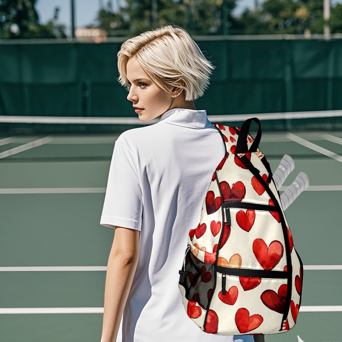 Pickleball Sling Bag for Women and Men - Backpack with Nylon Fabric/Woven Strap/Mesh Pocket/Fence Hook/Adjustable Bag Red Heart Pattern