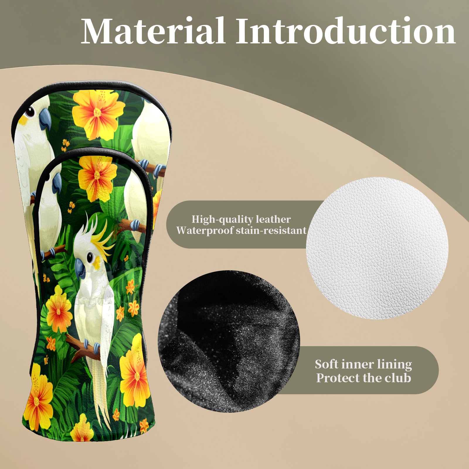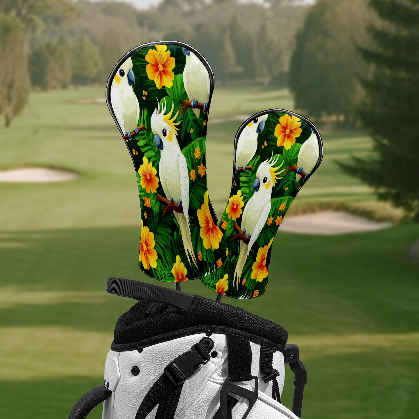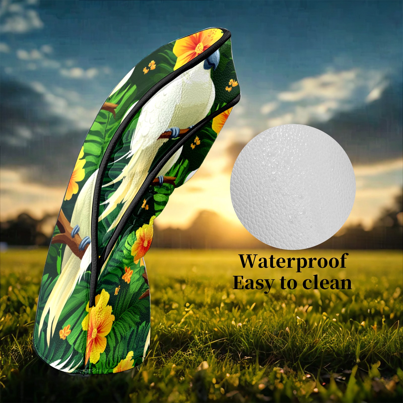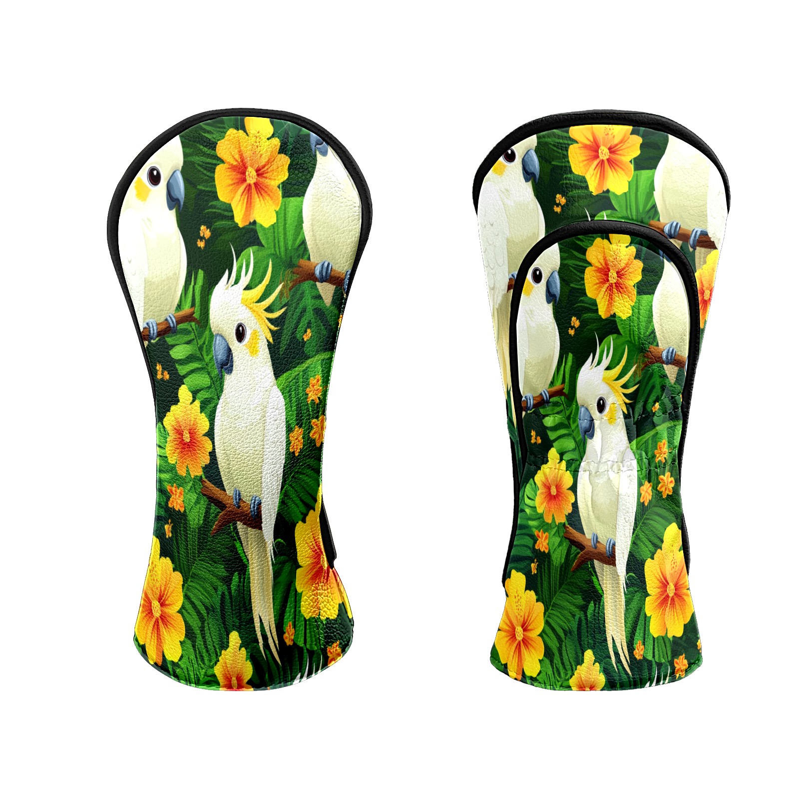 Golf Head Covers for Woods and Driver Waterproof Leather Golf Club Head Covers for Women Men Golf Driver Fairway Wood Headcover White Parrot & Flower Pattern