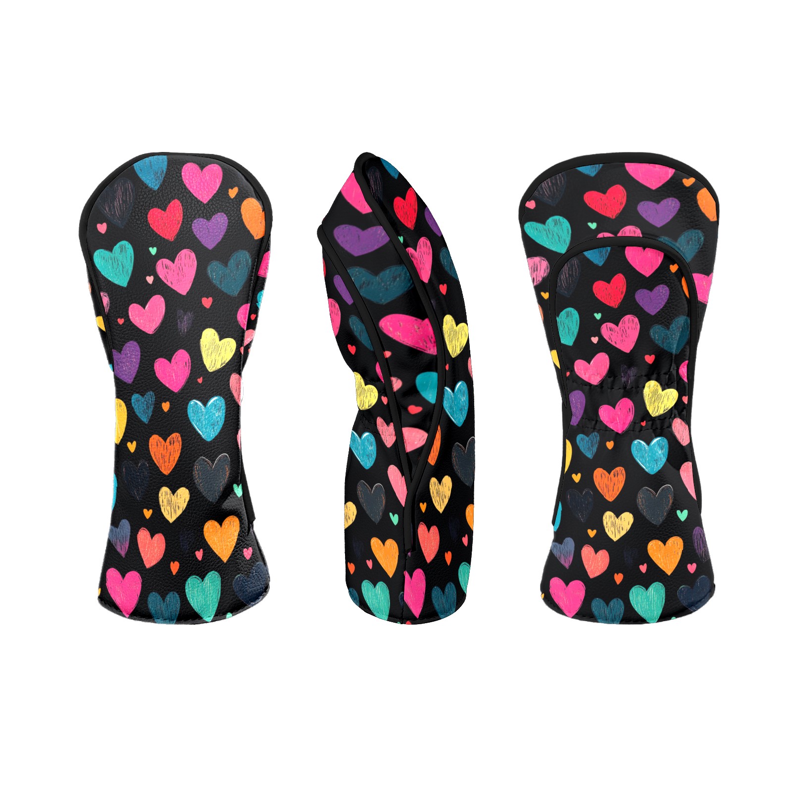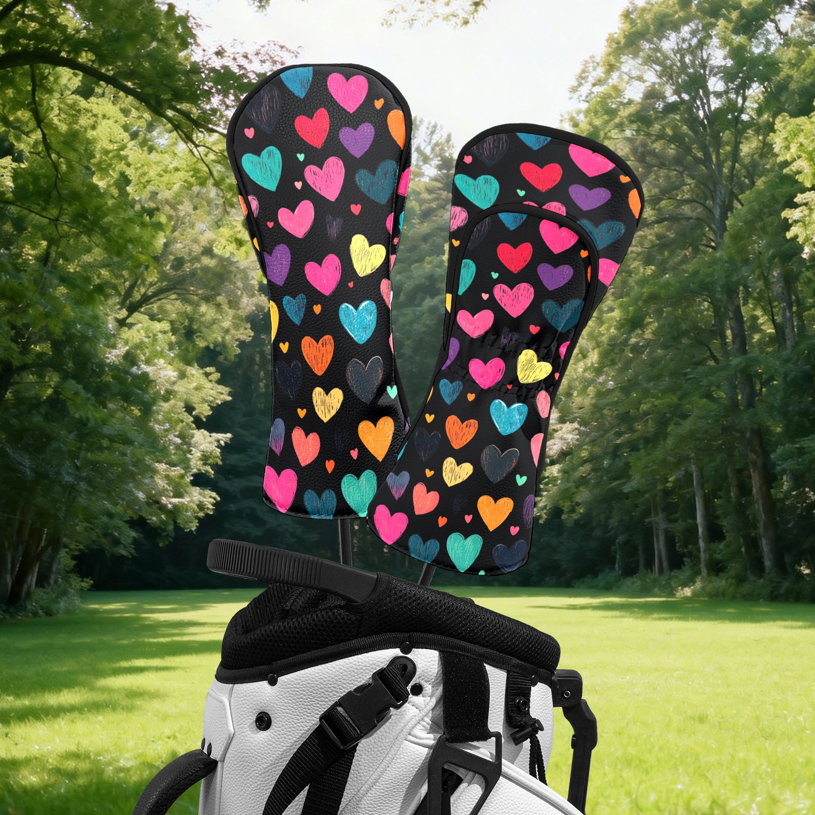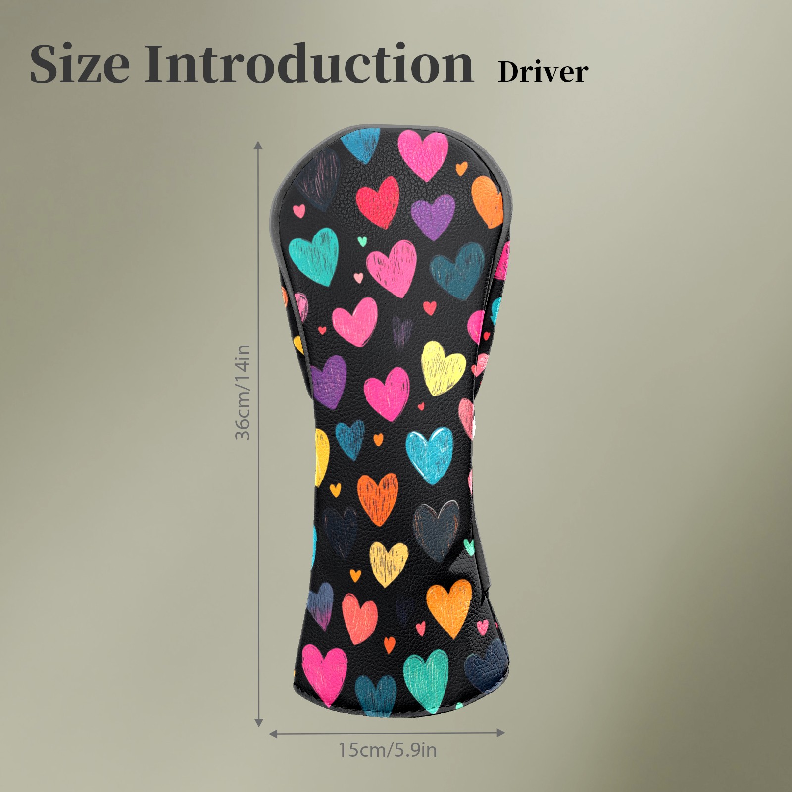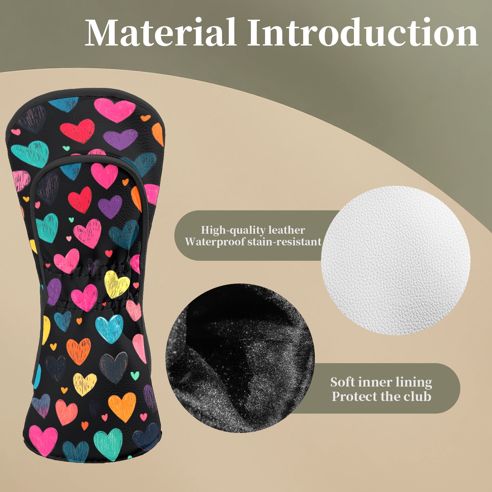 Golf Head Covers Fit Driver Headcover, Fairway Wood, and Hybrid Covers for Colorful Heart Pattern Design, Waterproof PU Leather, Classic Golf Gift & Accessories for Golfers