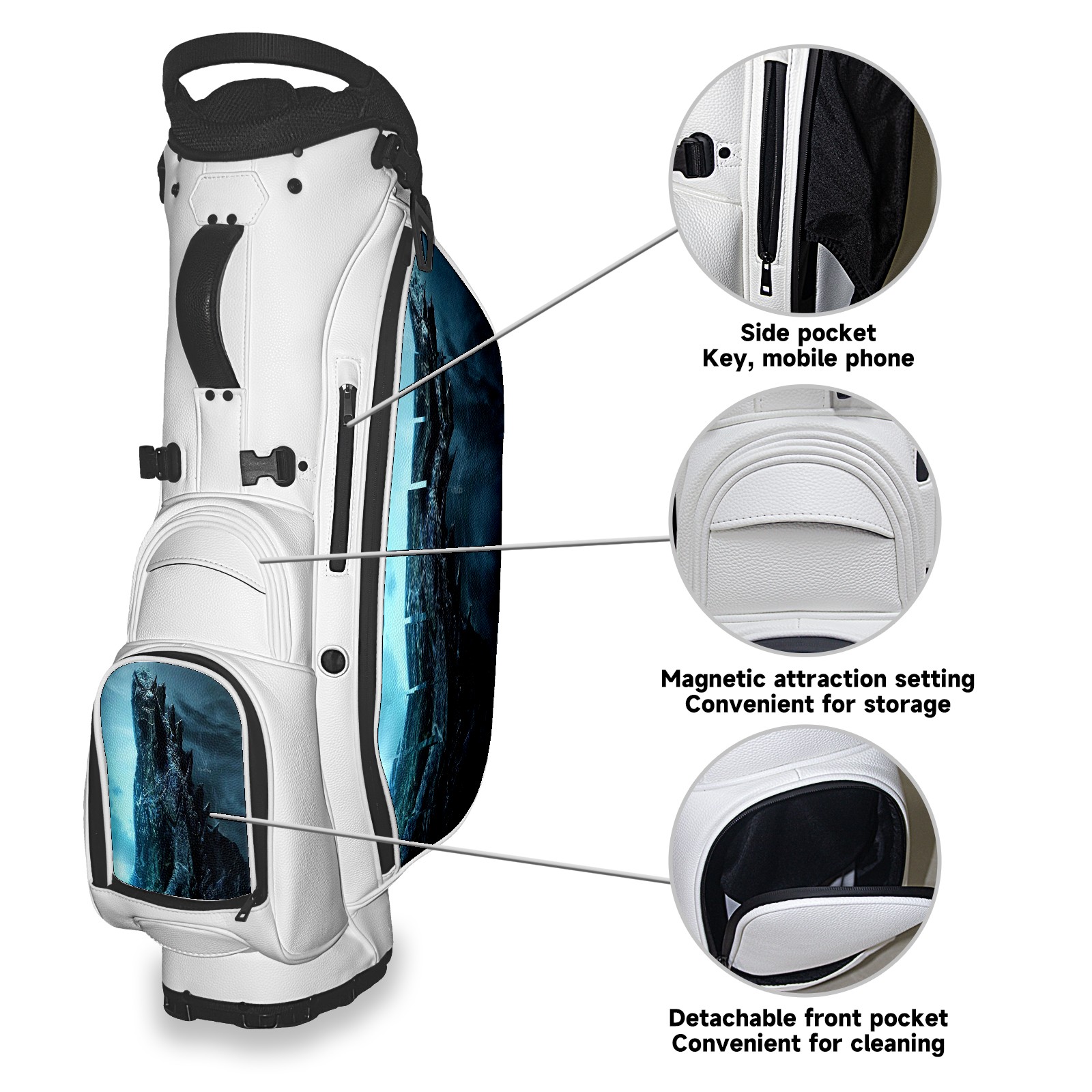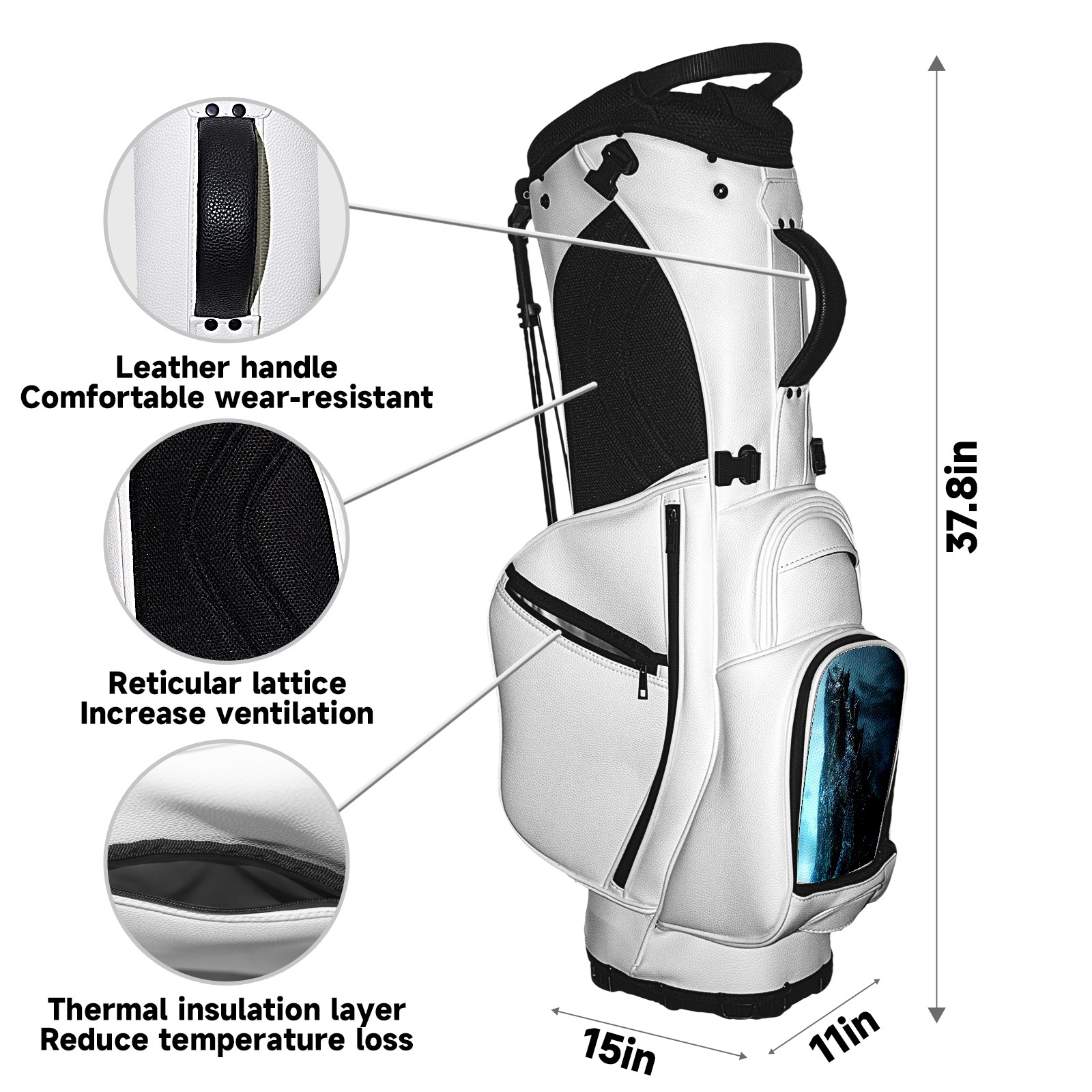 • <p>The Golf Stand Bag, designed specifically for golf enthusiasts, offers a choice of 5 - way and 14 - way top dividers. Its 5/14 - compartment design with independent full - size club compartments safeguards clubs from collisions. Equipped with a rain cover, waterproof zippered pockets (tested to resist moderate to heavy rain), and a high - performance cooler pouch that can keep drinks cold for hours, it ensures a convenient golfing experience. The bag features thickened, breathable neoprene shoulder straps and an adjustable chest buckle, reducing shoulder fatigue by 35% compared to regular bags, and its automatic aluminum alloy stand provides stable support on various terrains. Crafted from top - tier, water - resistant litchi - grain PU leather, with double - stitched edges, reliable zippers tested for over 15,000 cycles, and anti - abrasion bottom studs, it guarantees durability. You can personalize it with embroidery on the front pocket and rain cover side (15*15cm area), and it comes in classic black and white, with a matte finish and litchi - grain texture that combines business and leisure styles. Measuring 130 cm in height, 37 cm in width, and 31 cm in depth (including rain cover) and 90 cm x 31 cm x 37 cm (excluding rain cover), it strikes a balance between storage and portability, capable of holding 14 standard - sized clubs and other essentials, and it also includes a dust cover. It's truly the perfect choice for golfers.<br></p>