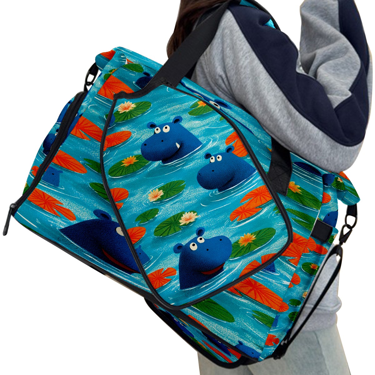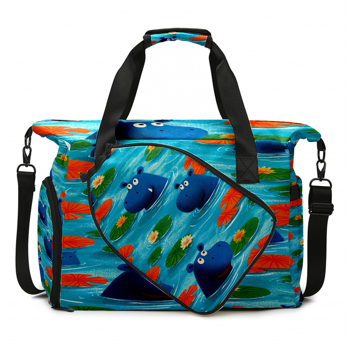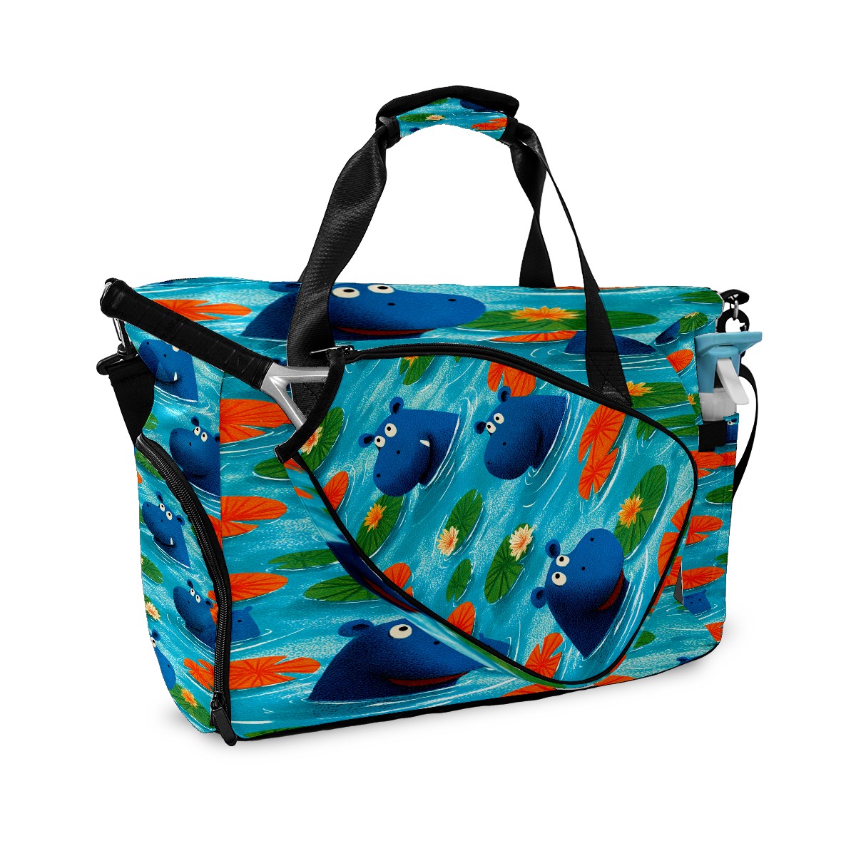 Counullo Playful Hippo Blue Gym Bag for Women & Tennis Bag, Large Sports Duffel Bag Waterproof with Ventilated Shoe Compartment & Front Racket Sleeve, Lightweight Travel Weekender Overnight Bag