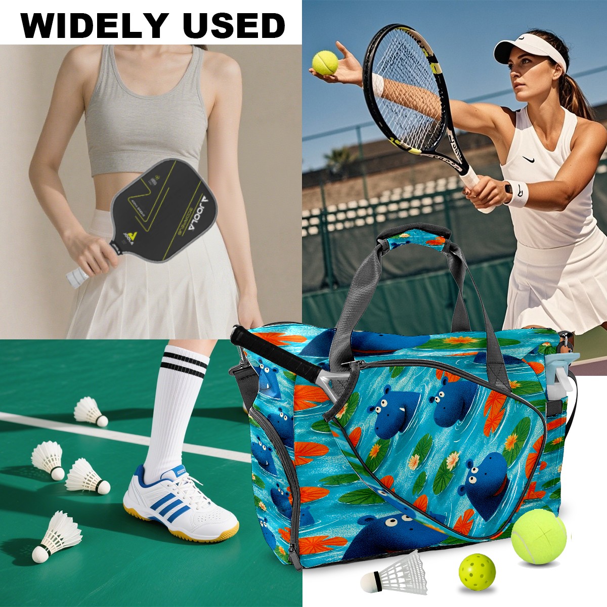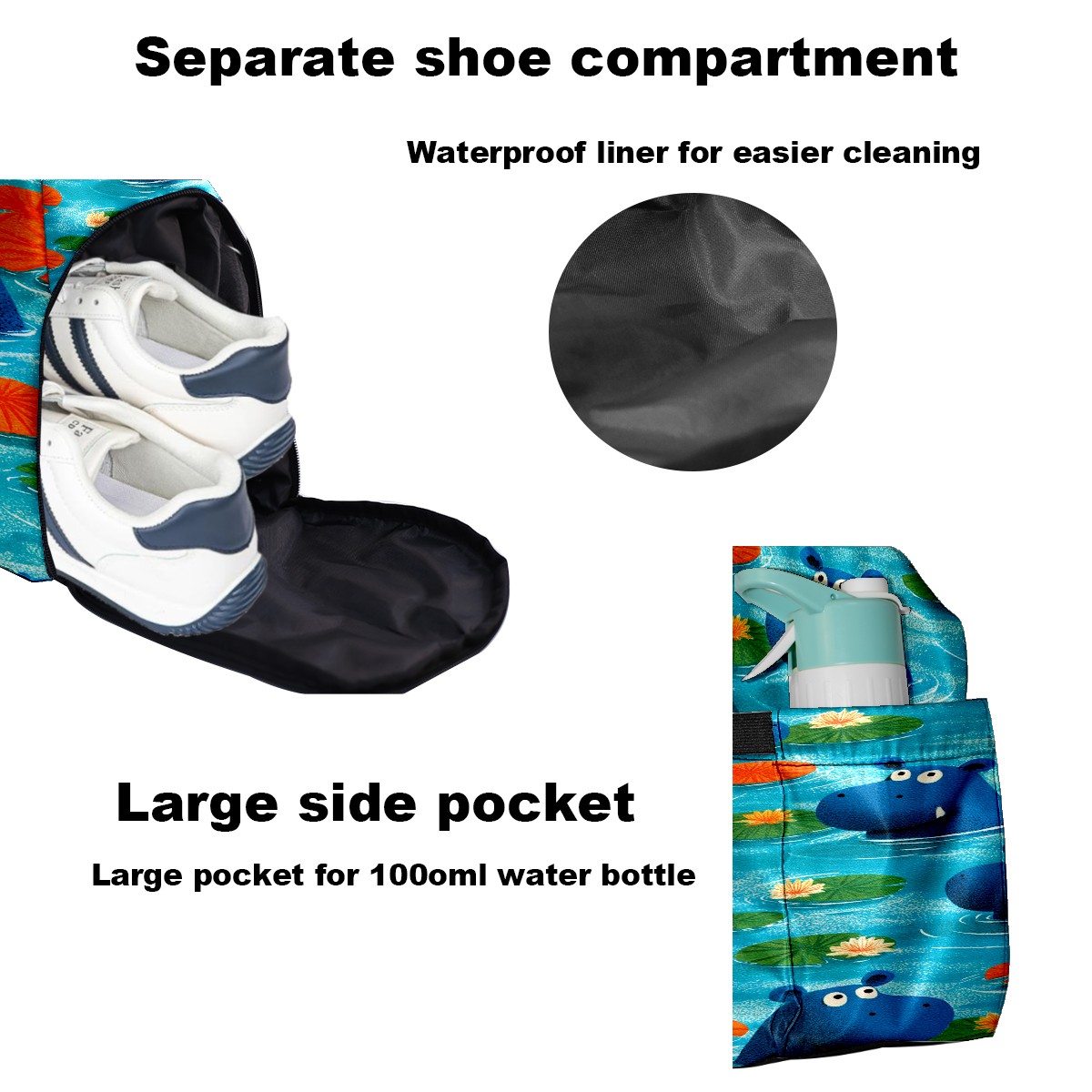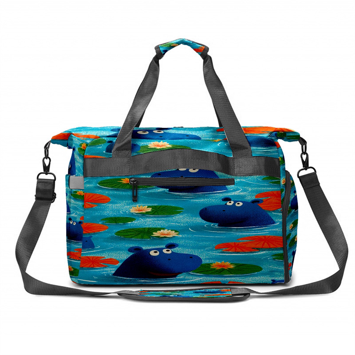 Counullo Playful Hippo Blue Gym Bag for Women & Tennis Bag, Large Sports Duffel Bag Waterproof with Ventilated Shoe Compartment & Front Racket Sleeve, Lightweight Travel Weekender Overnight Bag