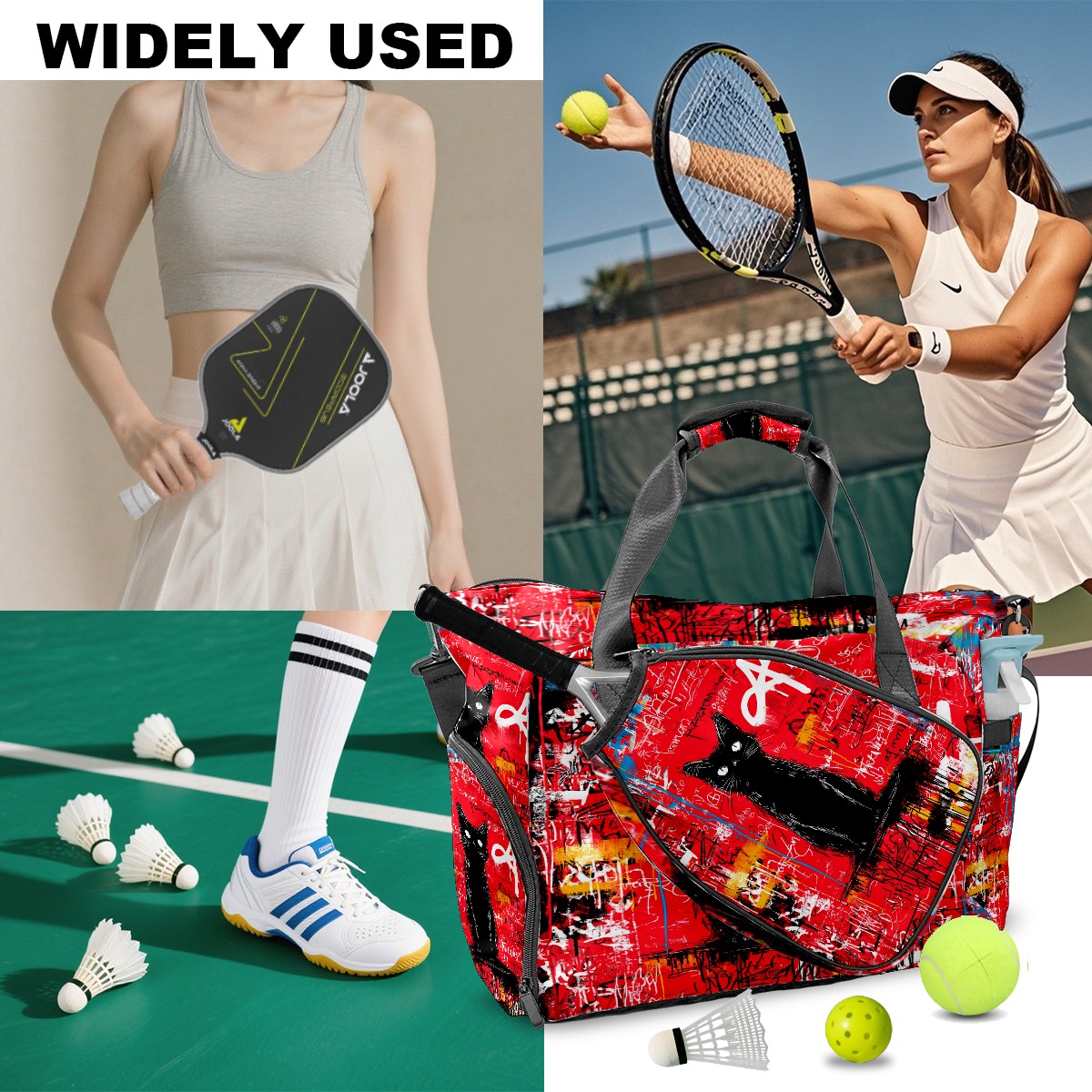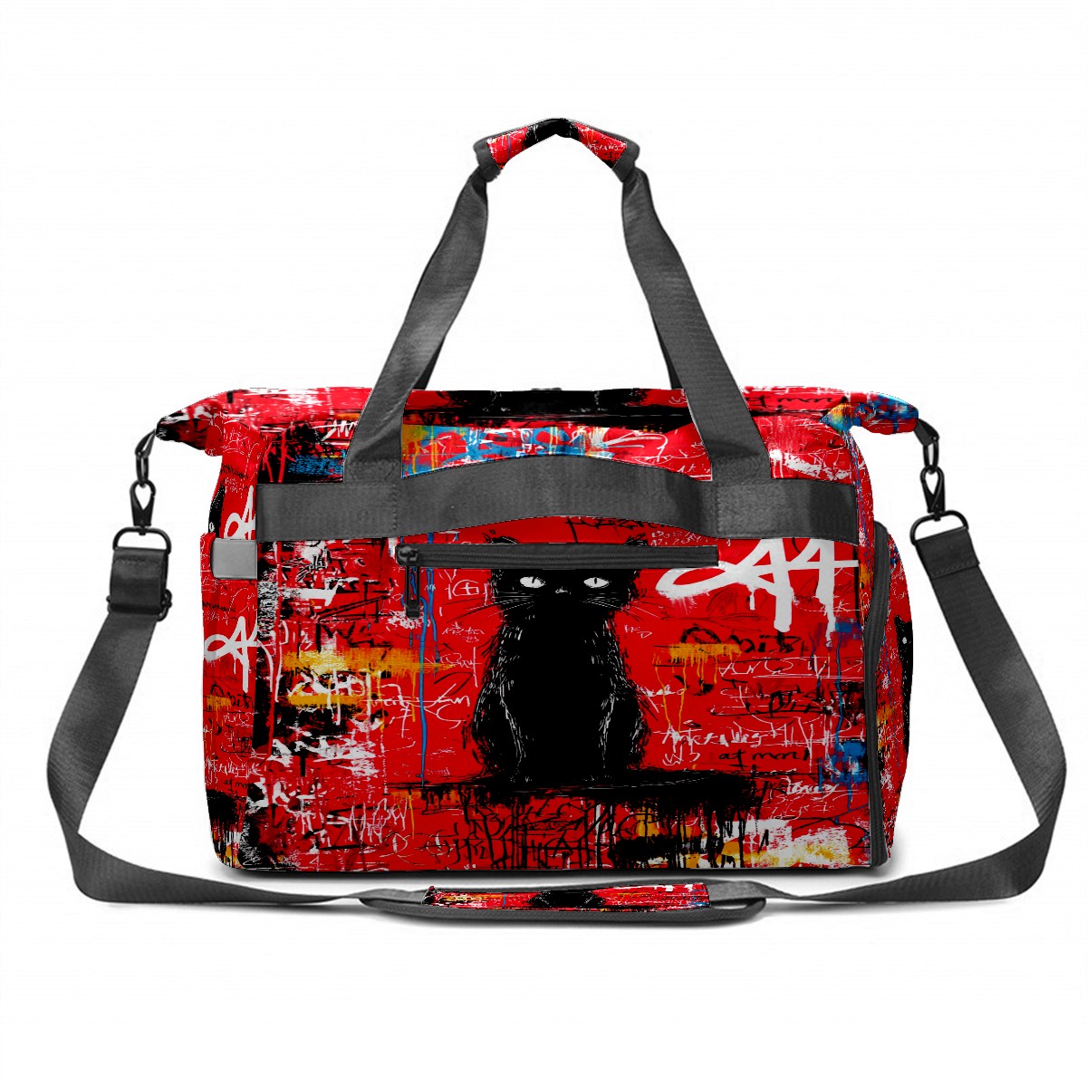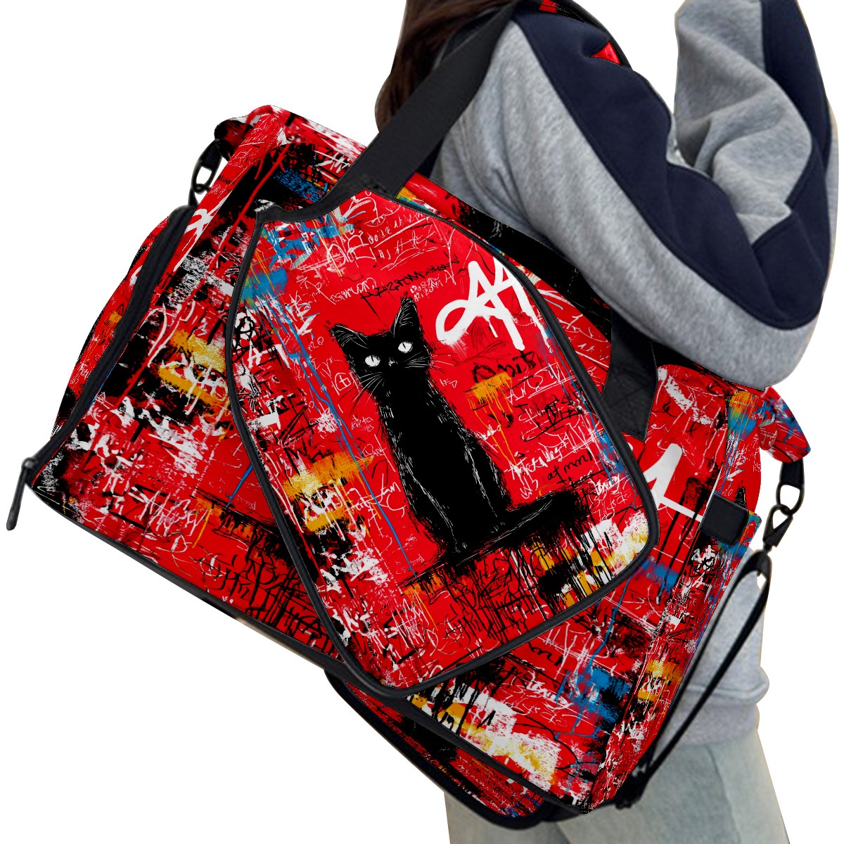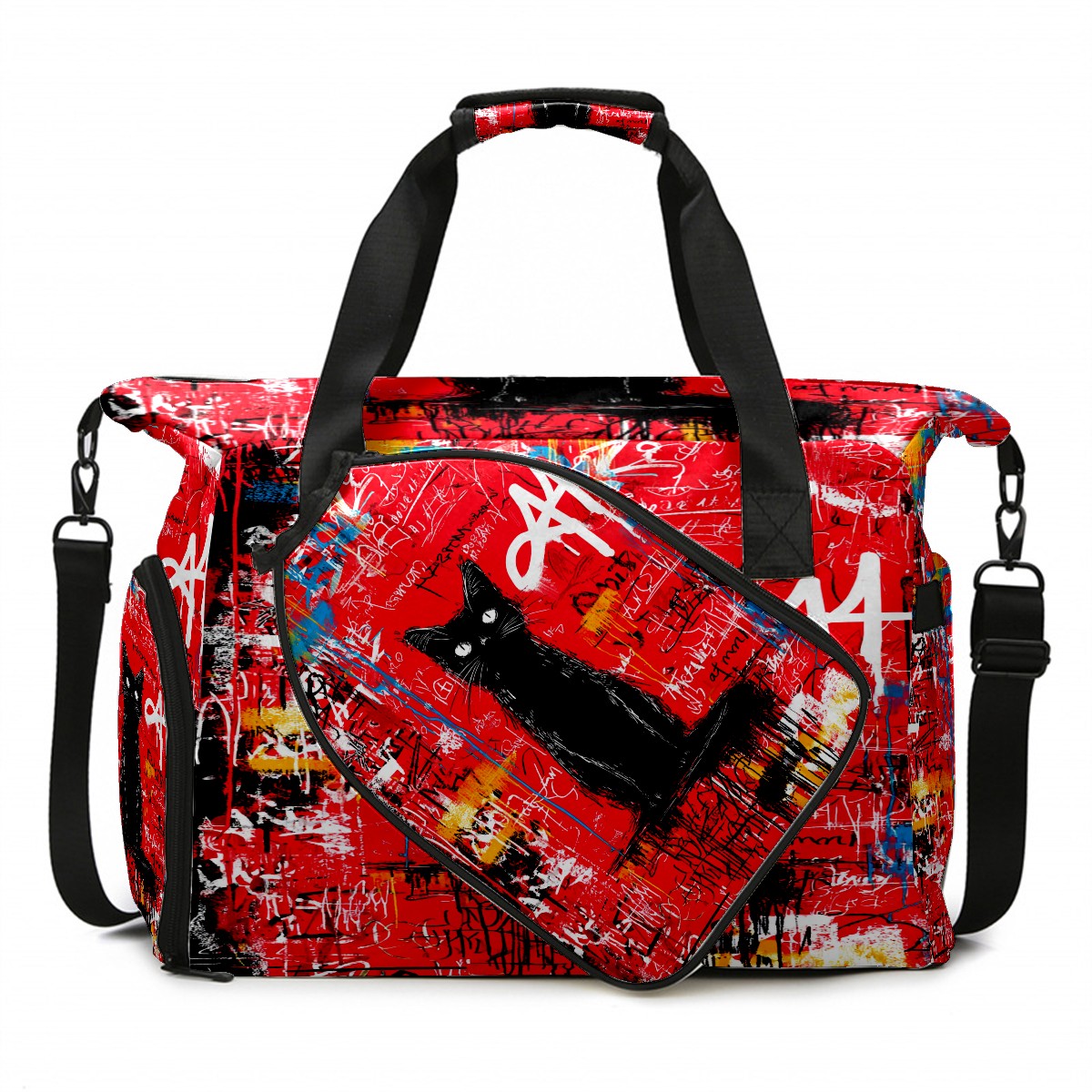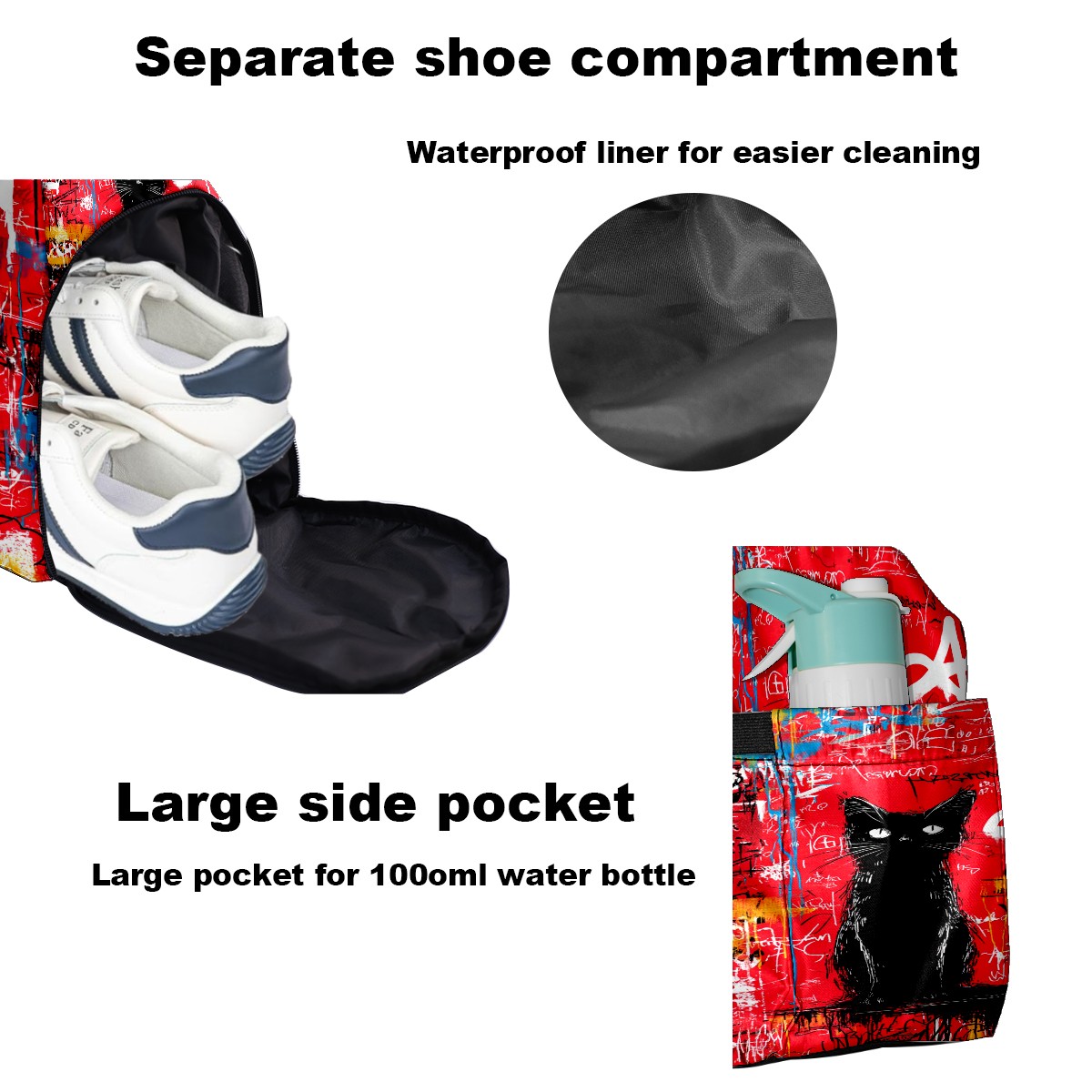 Counullo Artistic Black Cat Red Gym Bag for Women & Tennis Bag, Large Sports Duffel Bag Waterproof with Ventilated Shoe Compartment & Front Racket Sleeve, Lightweight Travel Weekender Overnight Bag