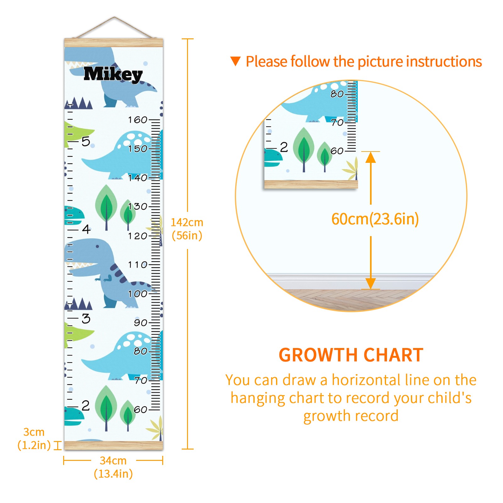 <p><b>Features:</b></p> <p>Rope for Hanging</p> <p>Material: Linen + Wood</p> <p>Dimensions: 13.4x56 inches</p> <p>Package Included: 1 * Baby Growth Chart</p> <p><b>Baby height growth chart can be used anywhere</b></p> <p>Ideal for kids nursery decoration, kids bedroom, interior walls or windows, playroom, living room, homedecoration.Add name and make the growth chart special!</p> <p><b>Easy to fold and carry</b></p> <p>With rope at the top of the growth chart, it is easy to install and remove.You can fold it and unfold any time any where.</p> <p><b>Perfect Gift Idea for Kids</b></p> <p>Environmental and non-toxic for kids use, it must be a perfect gift for baby, kids, girls, and boys.This is a best choice for your friend who have kids or baby as a popular gift.</p> <p><b>Easy to read</b></p> <p>Measurement accrate with 2 scales, Centimeters and feet. The letters are big enough, very easy to read.</p> <p><b>60cm(23.6inch) Over Ground Design</b></p> <p>Not only can protect from dust and other damage, but also will not interfere in floor cleaning.</p>