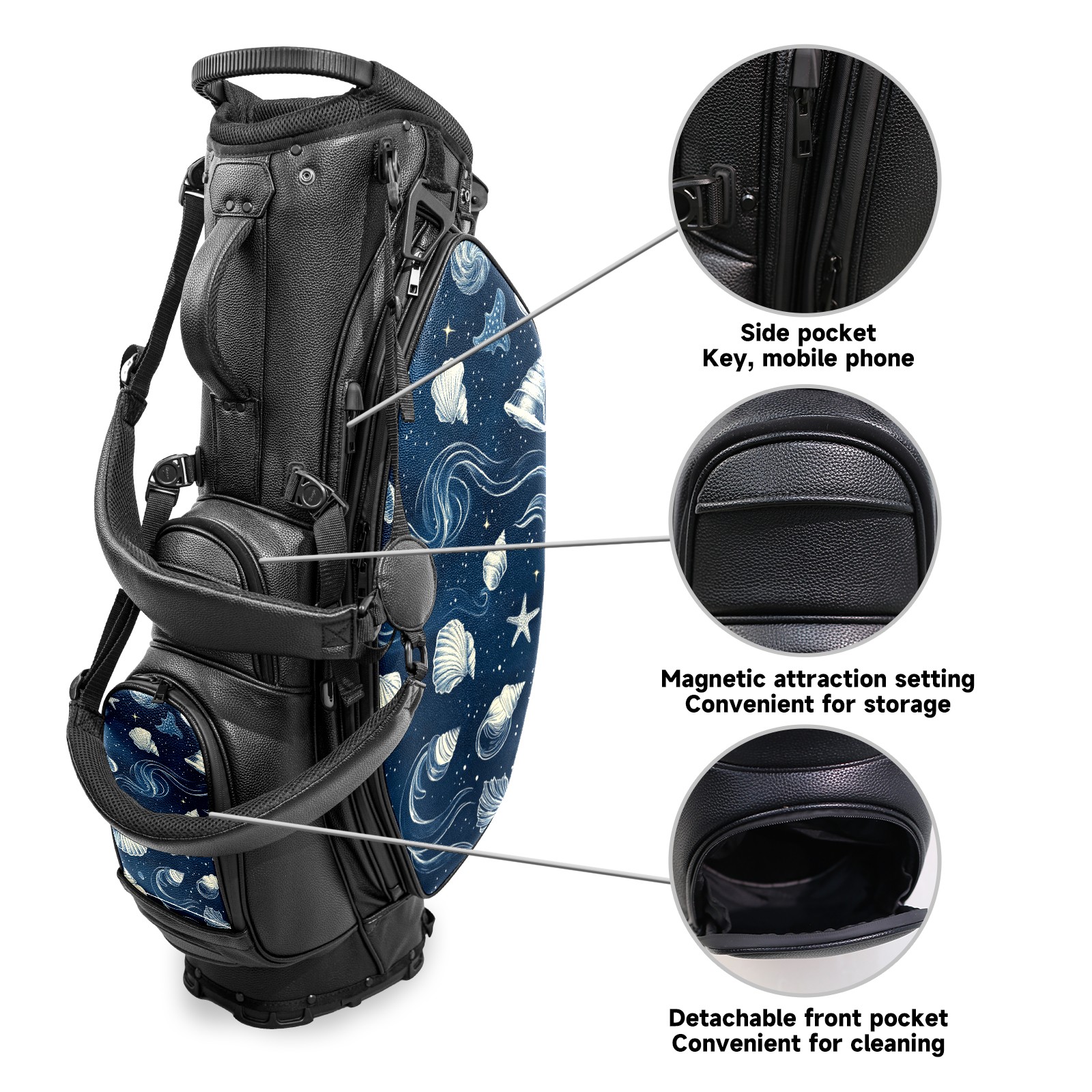 <p>This golf cart bag combines versatility with durability, providing comprehensive protection and convenient access for your clubs. The five-way top compartments provide strategic zoning for easily storing a variety of clubs and protecting them from impacts and wear. The PU fabric and sturdy plastic base combine premium quality with durability. The versatile storage system includes multiple zippered pockets and a separate cooler compartment for storing equipment, accessories, and drinks. The portable rear handle allows for easy transport. The ergonomic, padded shoulder straps are adjustable and removable to fit your shoulder and reduce weight. A built-in rain cover effectively keeps out moisture, ensuring your clubs stay dry and protected in wet weather. This is the ideal golf bag for your golfing adventure.<br></p>