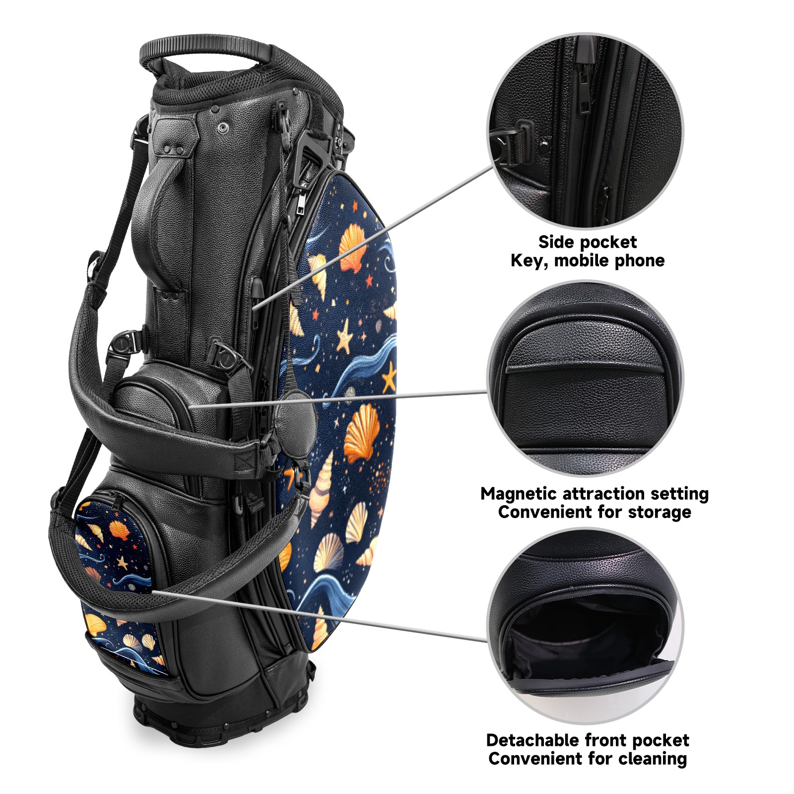 <p>This golf cart bag combines versatility with durability, providing comprehensive protection and convenient access for your clubs. The five-way top compartments provide strategic zoning for easily storing a variety of clubs and protecting them from impacts and wear. The PU fabric and sturdy plastic base combine premium quality with durability. The versatile storage system includes multiple zippered pockets and a separate cooler compartment for storing equipment, accessories, and drinks. The portable rear handle allows for easy transport. The ergonomic, padded shoulder straps are adjustable and removable to fit your shoulder and reduce weight. A built-in rain cover effectively keeps out moisture, ensuring your clubs stay dry and protected in wet weather. This is the ideal golf bag for your golfing adventure.<br></p>