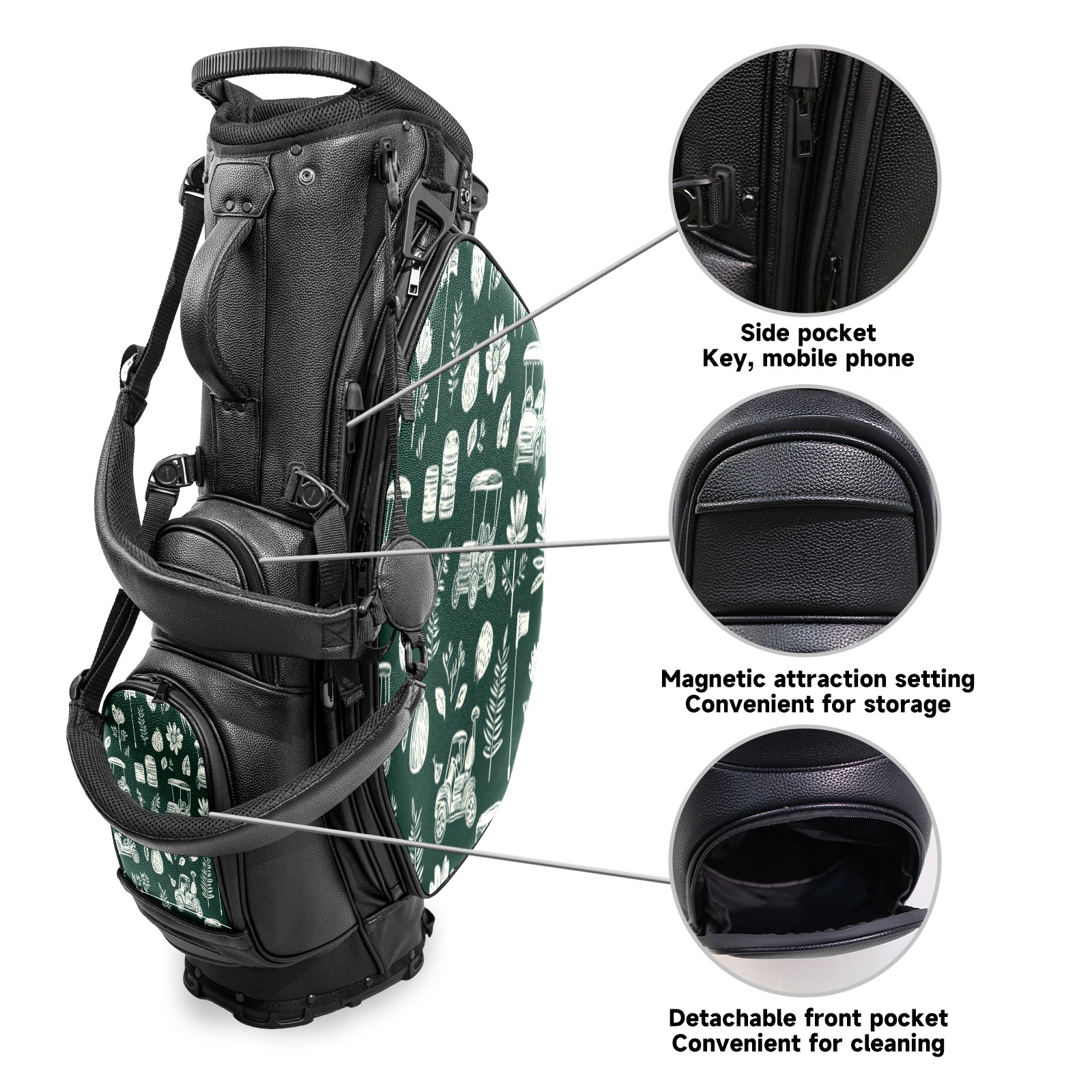 <p>This golf cart bag combines versatility with durability, providing comprehensive protection and convenient access for your clubs. The five-way top compartments provide strategic zoning for easily storing a variety of clubs and protecting them from impacts and wear. The PU fabric and sturdy plastic base combine premium quality with durability. The versatile storage system includes multiple zippered pockets and a separate cooler compartment for storing equipment, accessories, and drinks. The portable rear handle allows for easy transport. The ergonomic, padded shoulder straps are adjustable and removable to fit your shoulder and reduce weight. A built-in rain cover effectively keeps out moisture, ensuring your clubs stay dry and protected in wet weather. This is the ideal golf bag for your golfing adventure.<br></p>