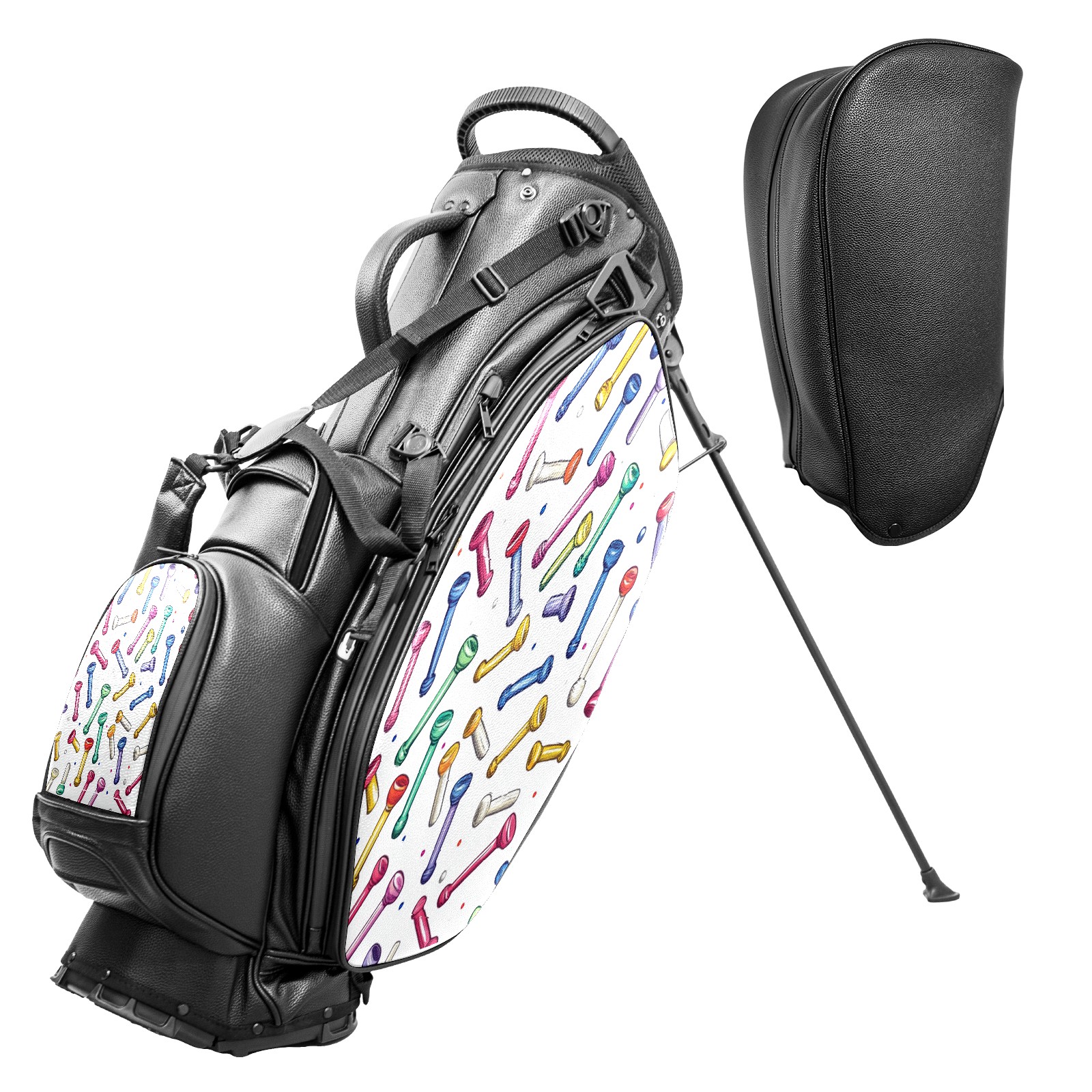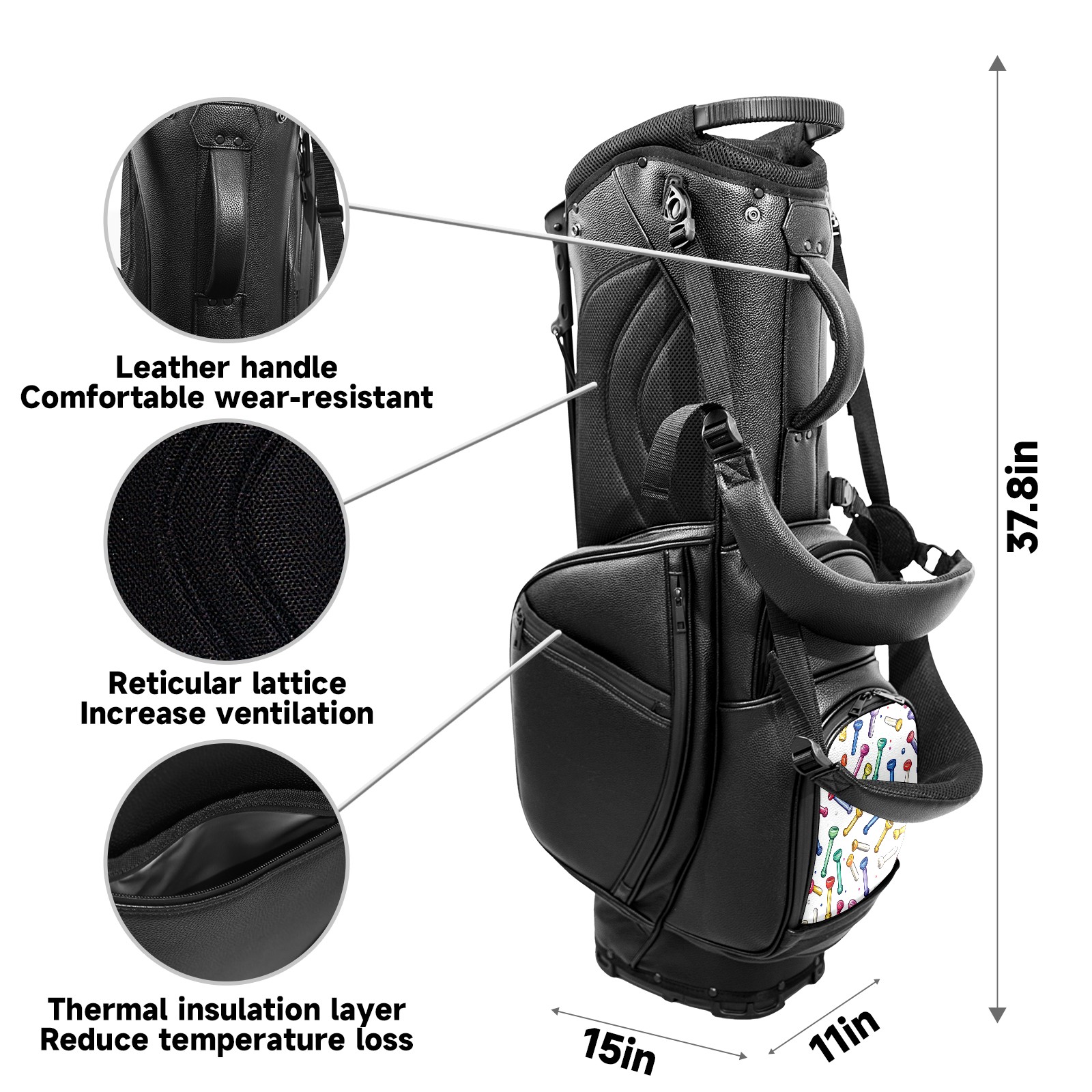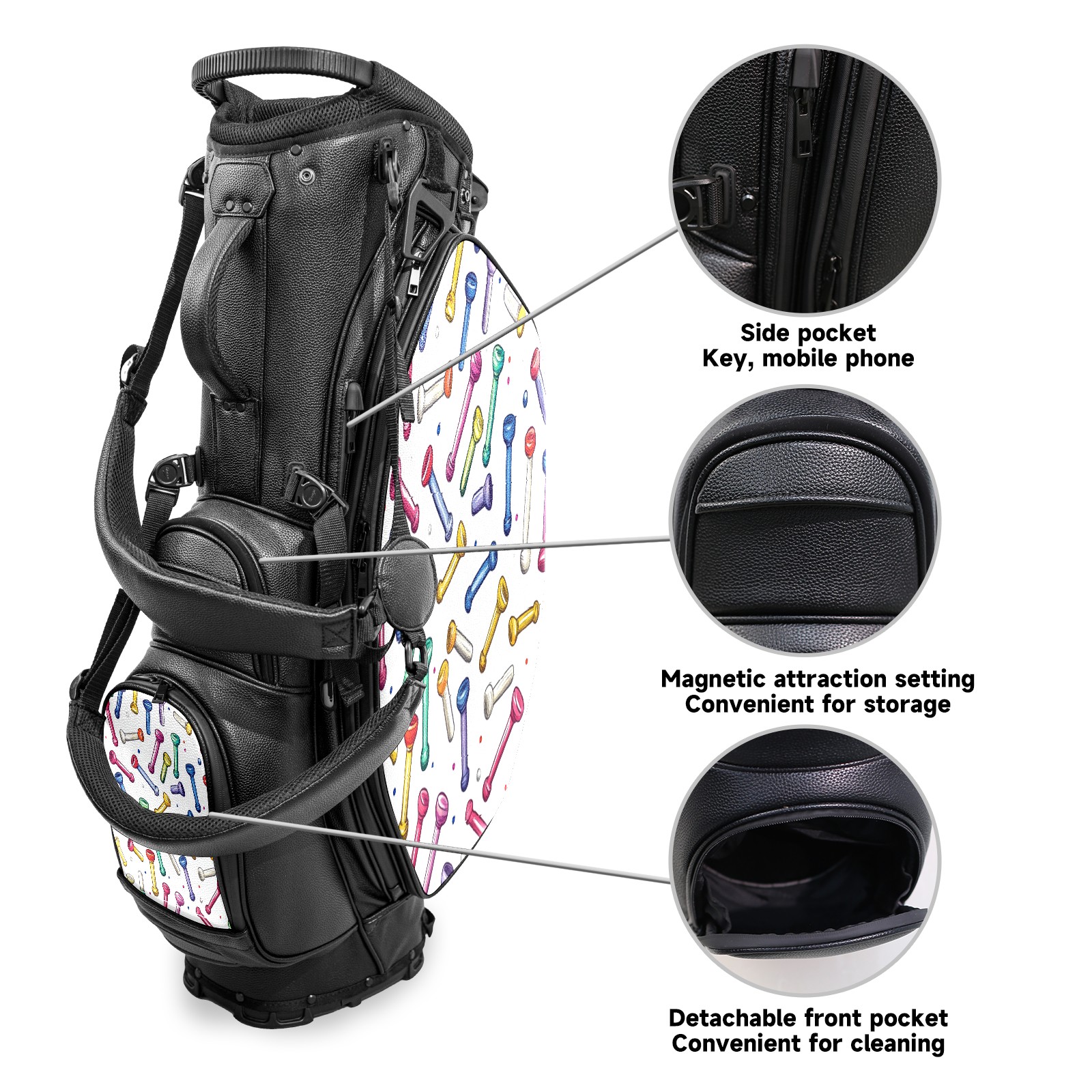 <p>This golf cart bag combines versatility with durability, providing comprehensive protection and convenient access for your clubs. The five-way top compartments provide strategic zoning for easily storing a variety of clubs and protecting them from impacts and wear. The PU fabric and sturdy plastic base combine premium quality with durability. The versatile storage system includes multiple zippered pockets and a separate cooler compartment for storing equipment, accessories, and drinks. The portable rear handle allows for easy transport. The ergonomic, padded shoulder straps are adjustable and removable to fit your shoulder and reduce weight. A built-in rain cover effectively keeps out moisture, ensuring your clubs stay dry and protected in wet weather. This is the ideal golf bag for your golfing adventure.<br></p>