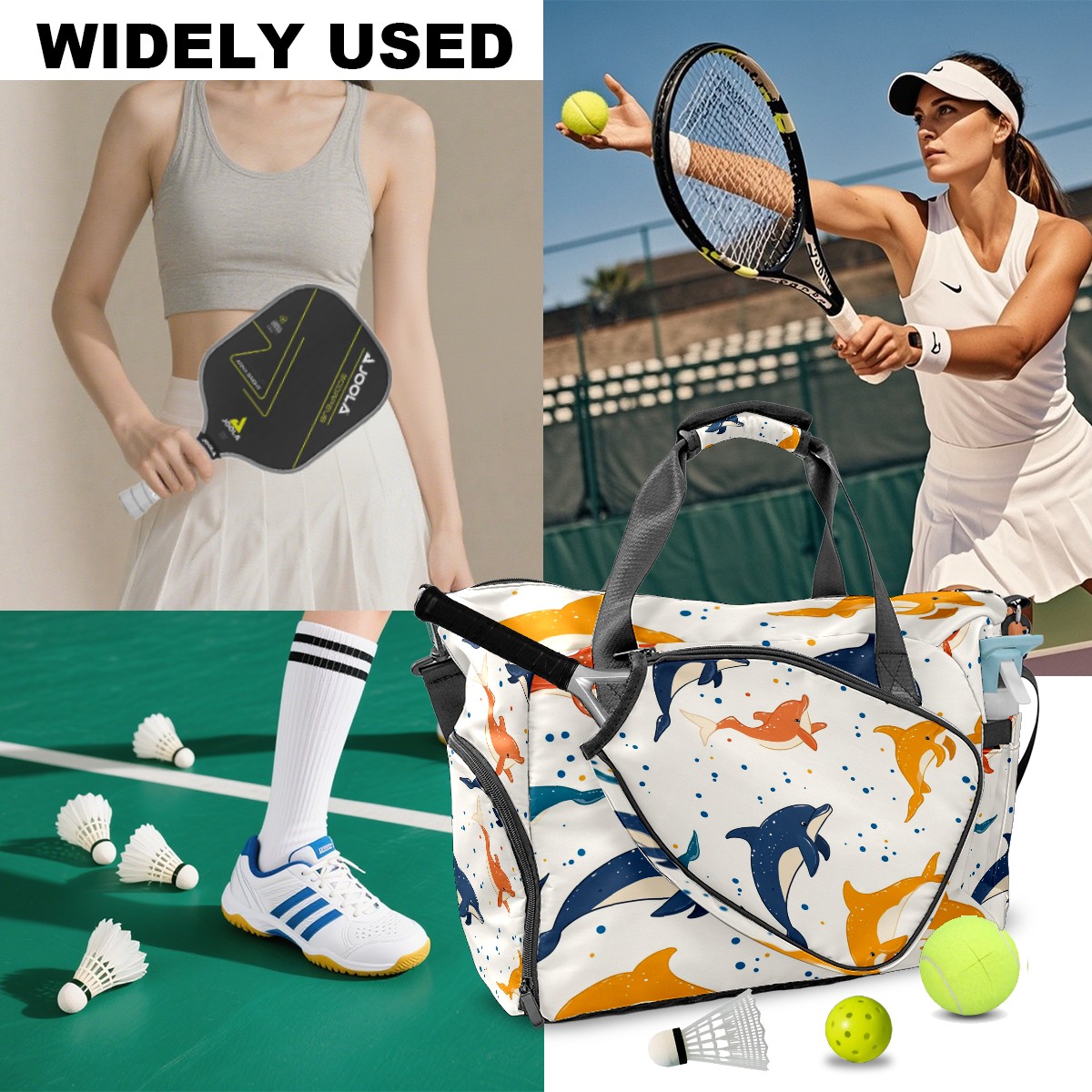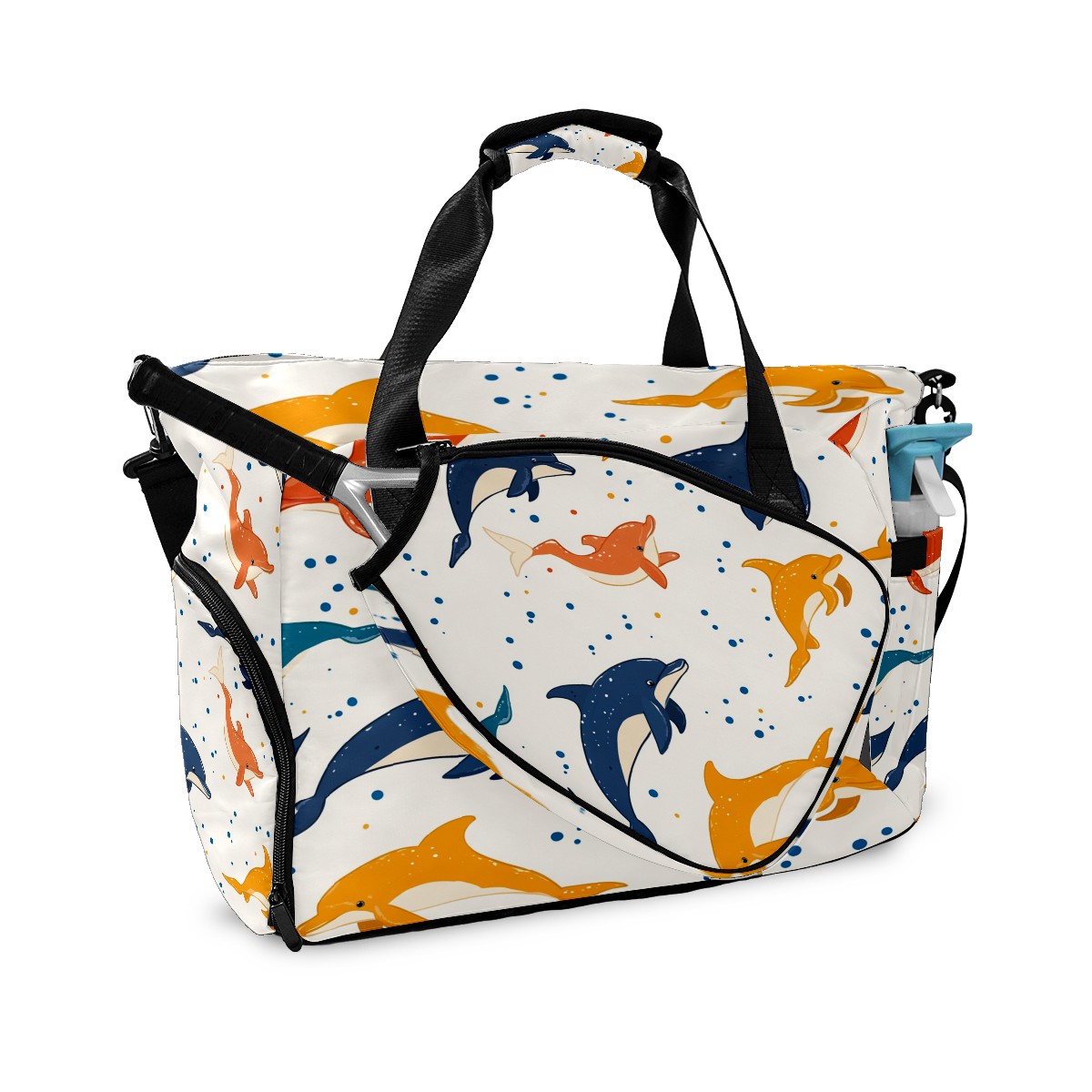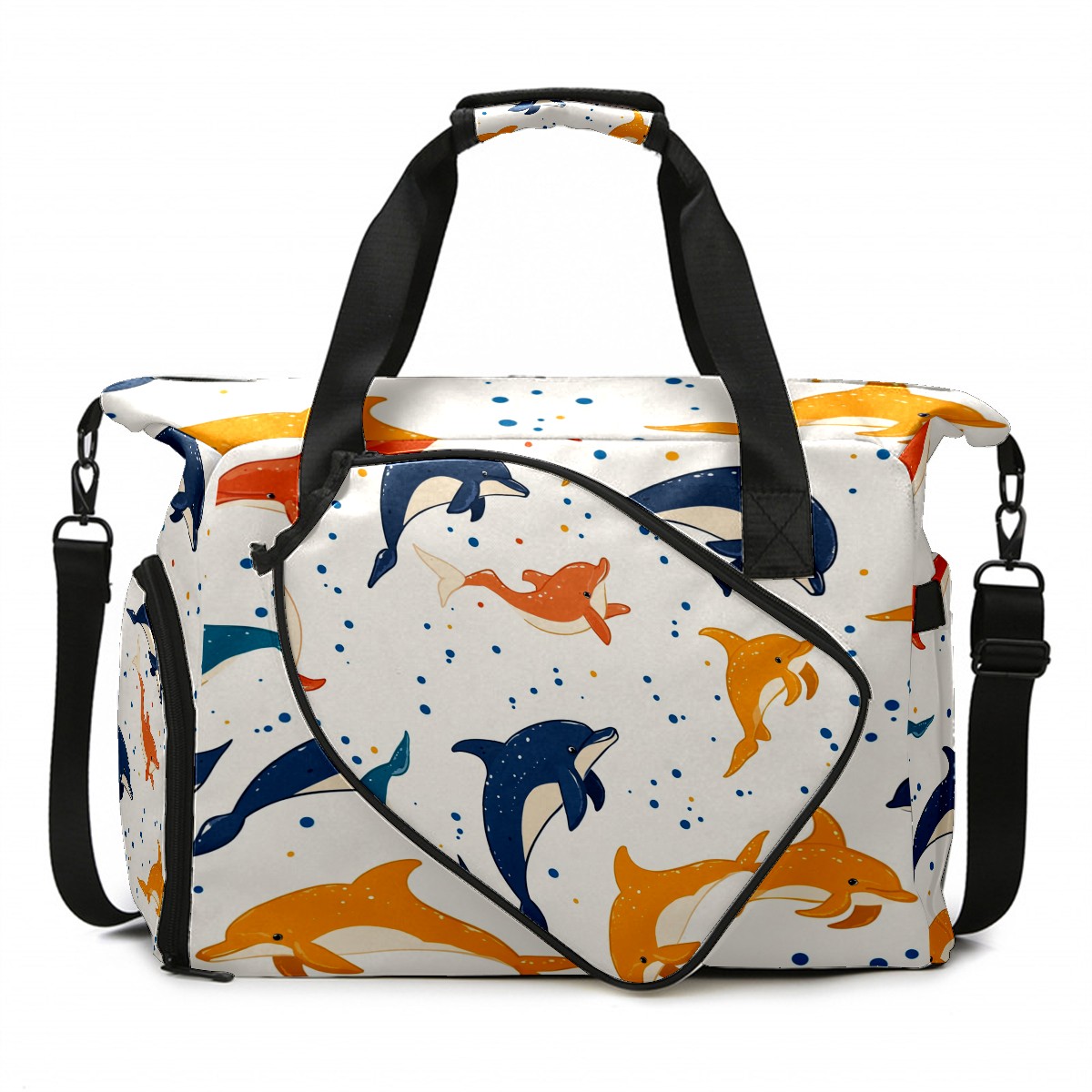 Pickleball Bag for Men Women with Exterior Paddle Pocket and Separate Shoe Compartment, Handbag, Shoulder Bag - Ideal Pickleball Gift Dolphin Polka Dots